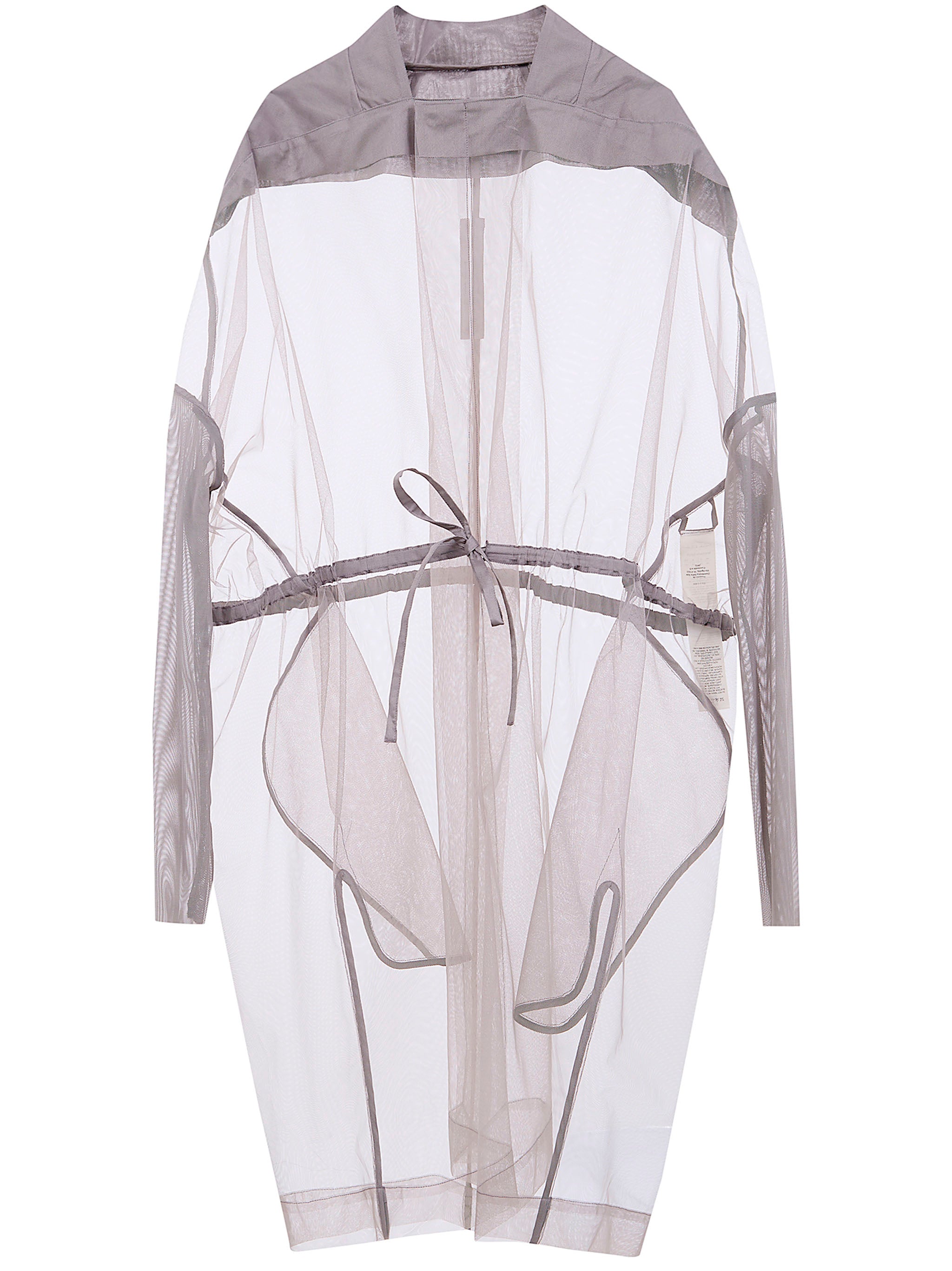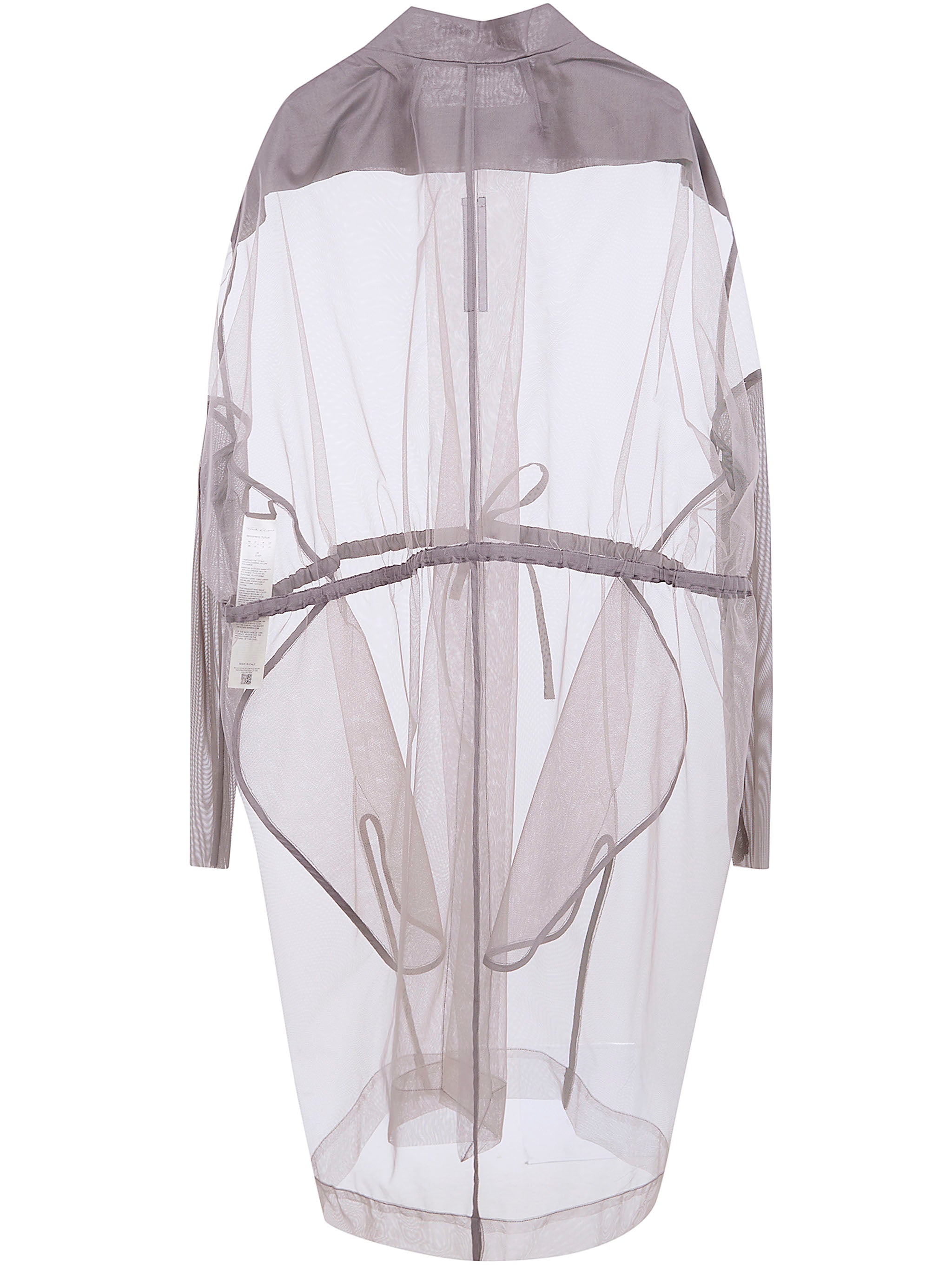 The adjustable drawstring waist tie allows you to customize the fit and create your desired shape, while the sheer mesh detailing on the shoulders and sleeves adds an edgy, contemporary dimension. Perfect for layering over minimalist ensembles, this lightweight coat transitions effortlessly from casual daytime wear to sophisticated evening outings.