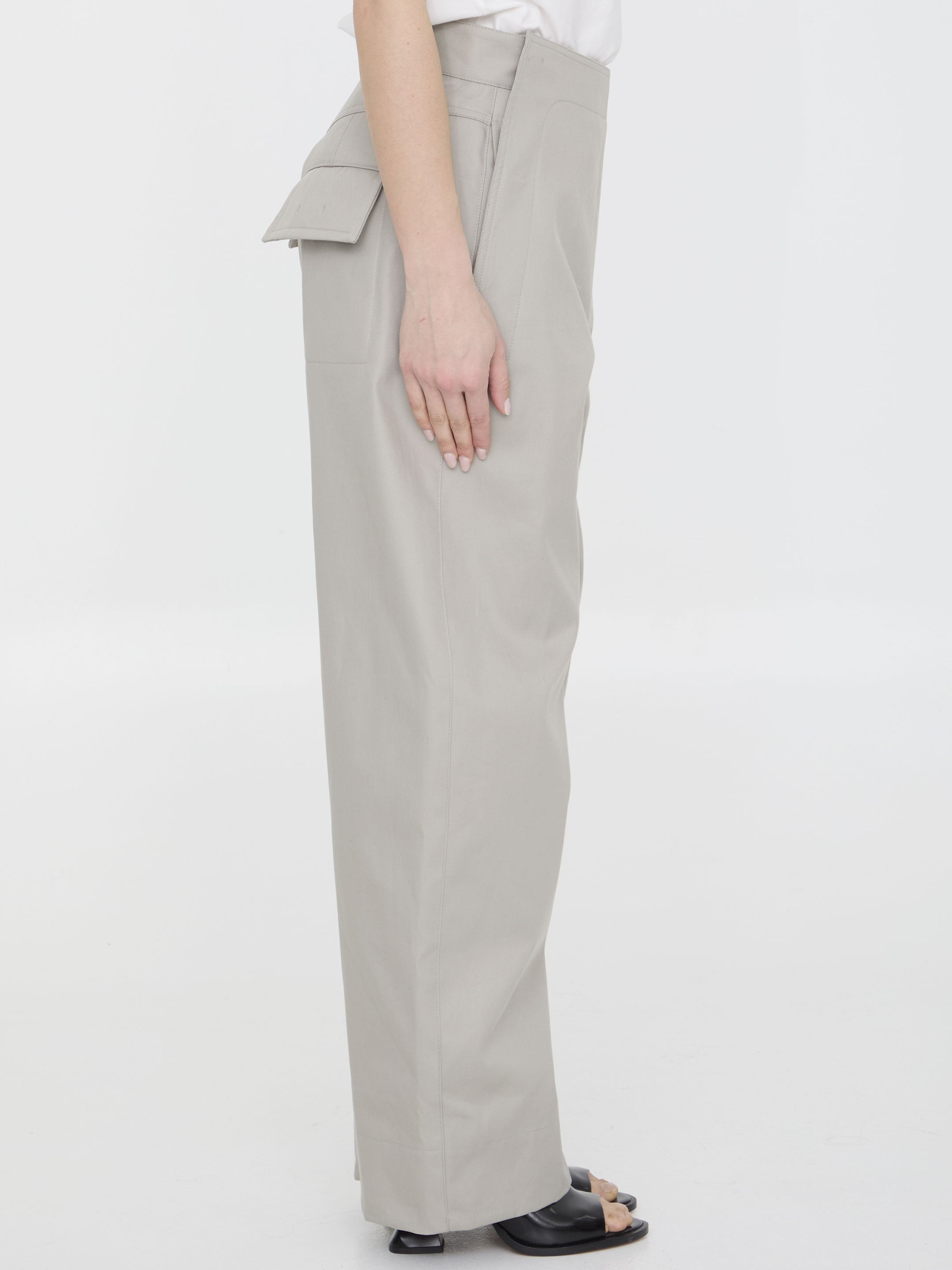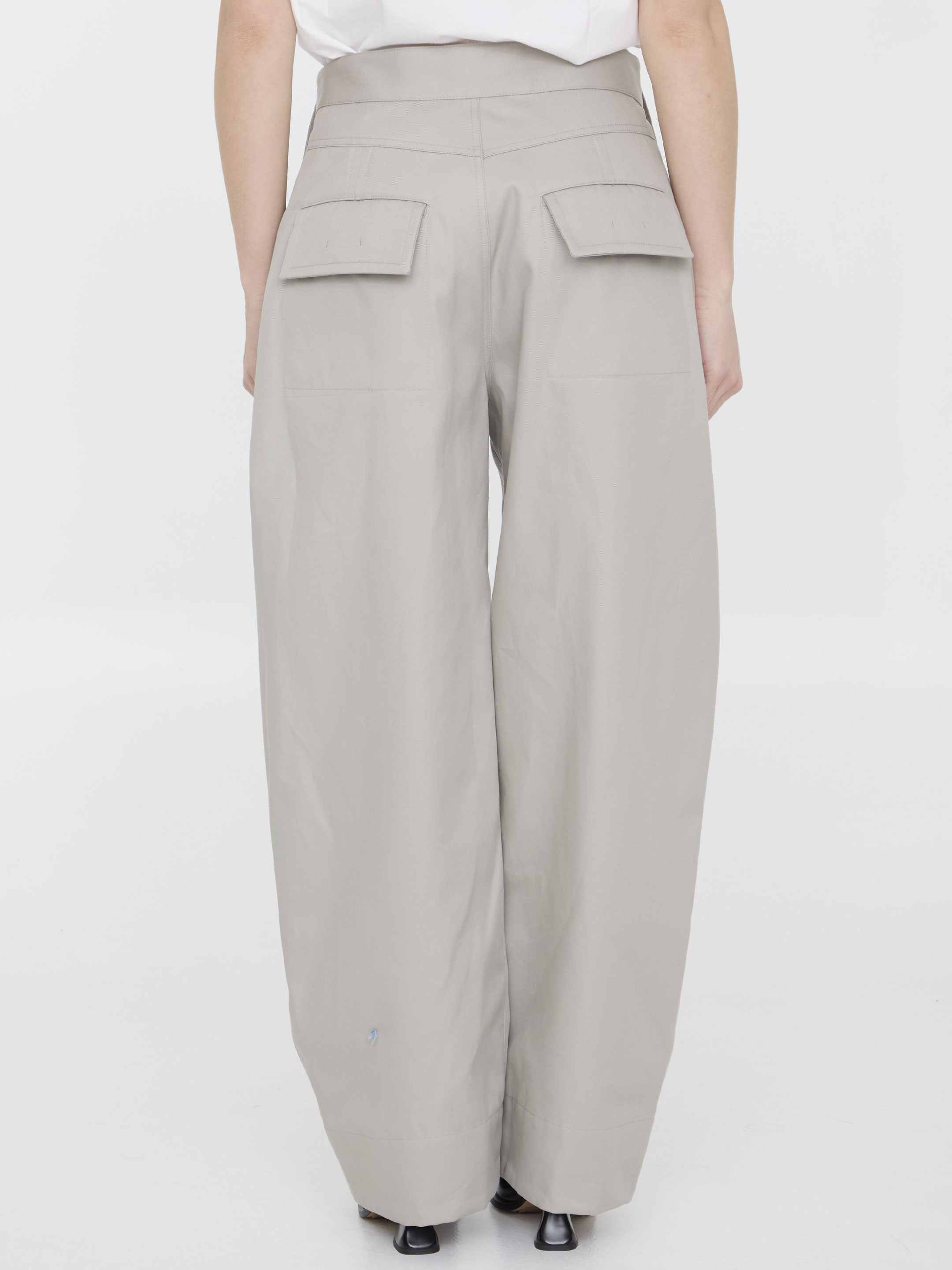 Sailor pants in putty-colored cotton. It features side button closure and zip, button and hook-and-eye closure, two side welt pockets and two rear buttoned flap pockets. Regular fit.