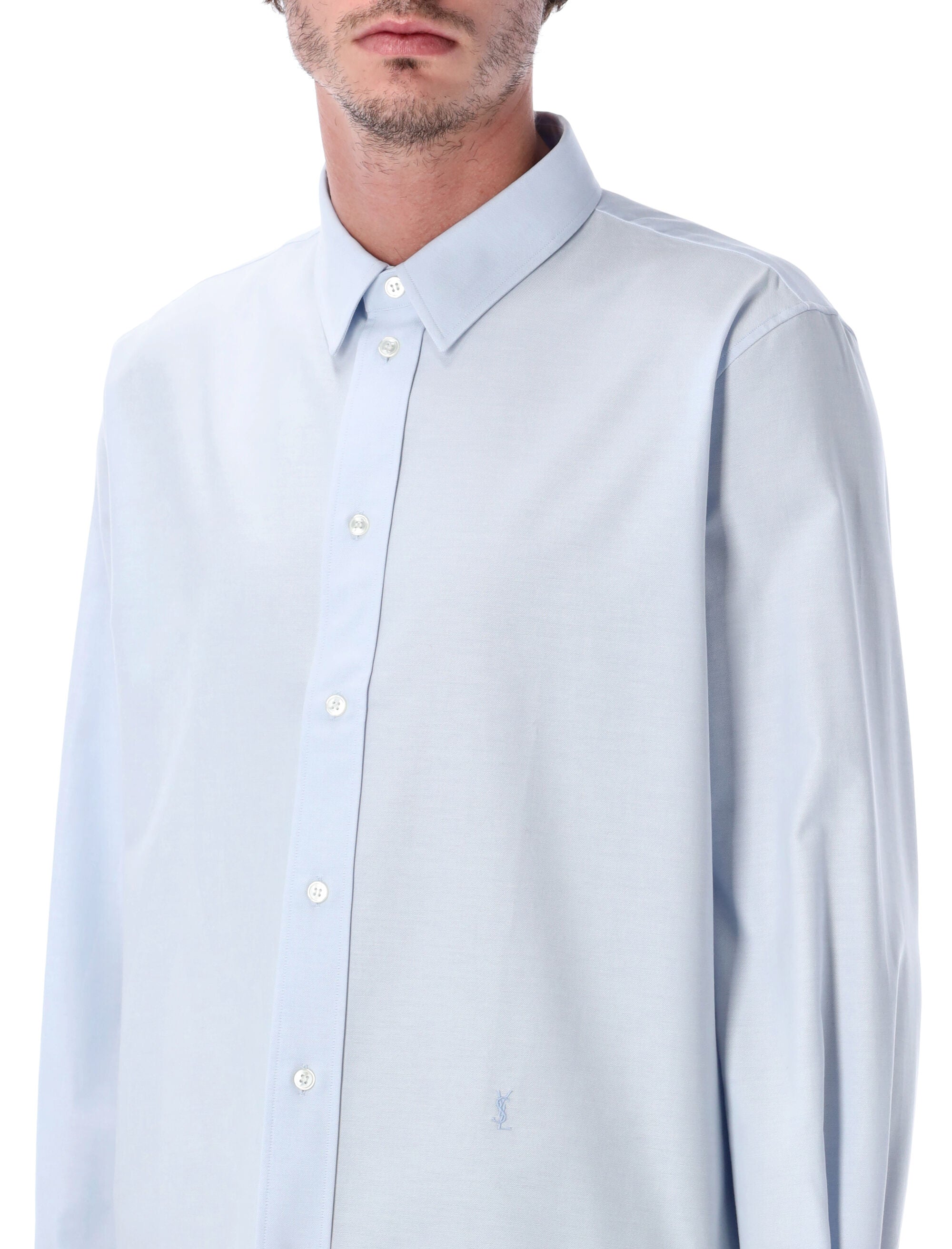 THE CASSANDRE OXFORD SHIRT BY SAINT LAURENT REDEFINES TIMELESS TAILORING WITH REFINED SIMPLICITY. CRAFTED IN PURE COTTON, IT FEATURES A CLASSIC POINTED COLLAR, ONE-BUTTON CUFFS, AND A STRAIGHT HEM FOR A CRISP, STRUCTURED SILHOUETTE.