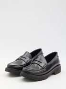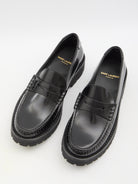 SAINT LAURENT LE LOAFER MOCCASINS IN SHINY LEATHER, BLACK WITH STACKED HEEL, THICK, POINTED ALMOND SOLE.