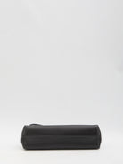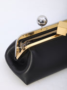Salon long pouch in ultra-soft black lamb leather. It features a snap closure with round and square knobs, engraved logo in silver and gold-tone metal, a removable thin shoulder strap, one main internal compartment, and an internal flat pocket, with a cotton lining. Dust bag included. Any imperfections in the leather should not be considered manufacturing defects, but rather a characteristic of the material.
