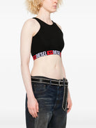 Elevate your athleisure wardrobe with the SANDRA-D-CORE Tank Top by Diesel. This sleek black sports bra features a classic crew neckline and a signature wide elasticated band adorned with bold Diesel and D logos for an unmistakably branded finish. Crafted from a comfortable blend of 95% cotton and 5% elastane, this versatile piece offers the perfect balance of stretch and breathability. Style it with high-waisted leggings for your workout, or pair it with denim for an effortlessly cool off-duty look. Whether you're hitting the gym or running errands, this essential tank top delivers both style and comfort.