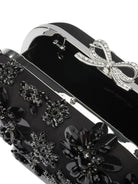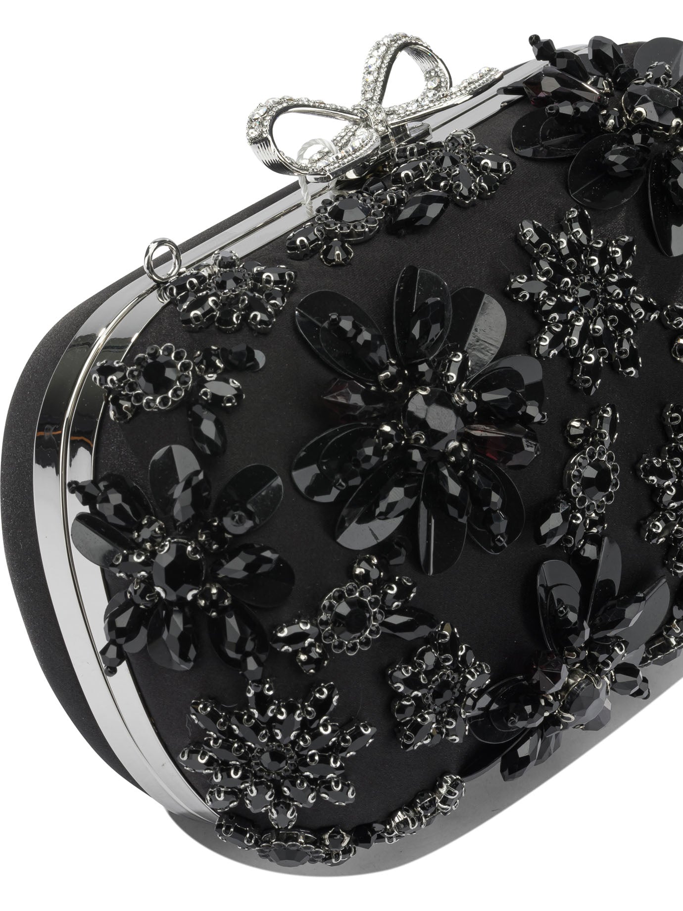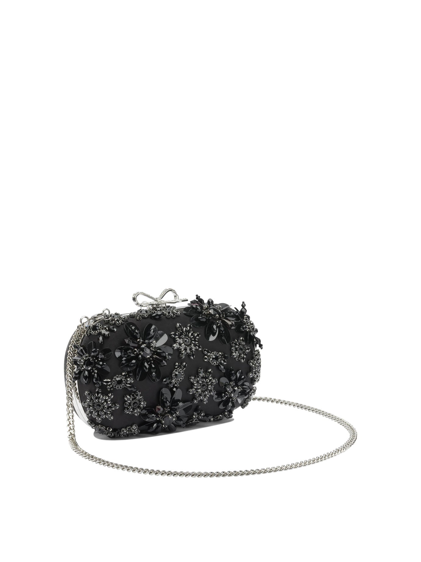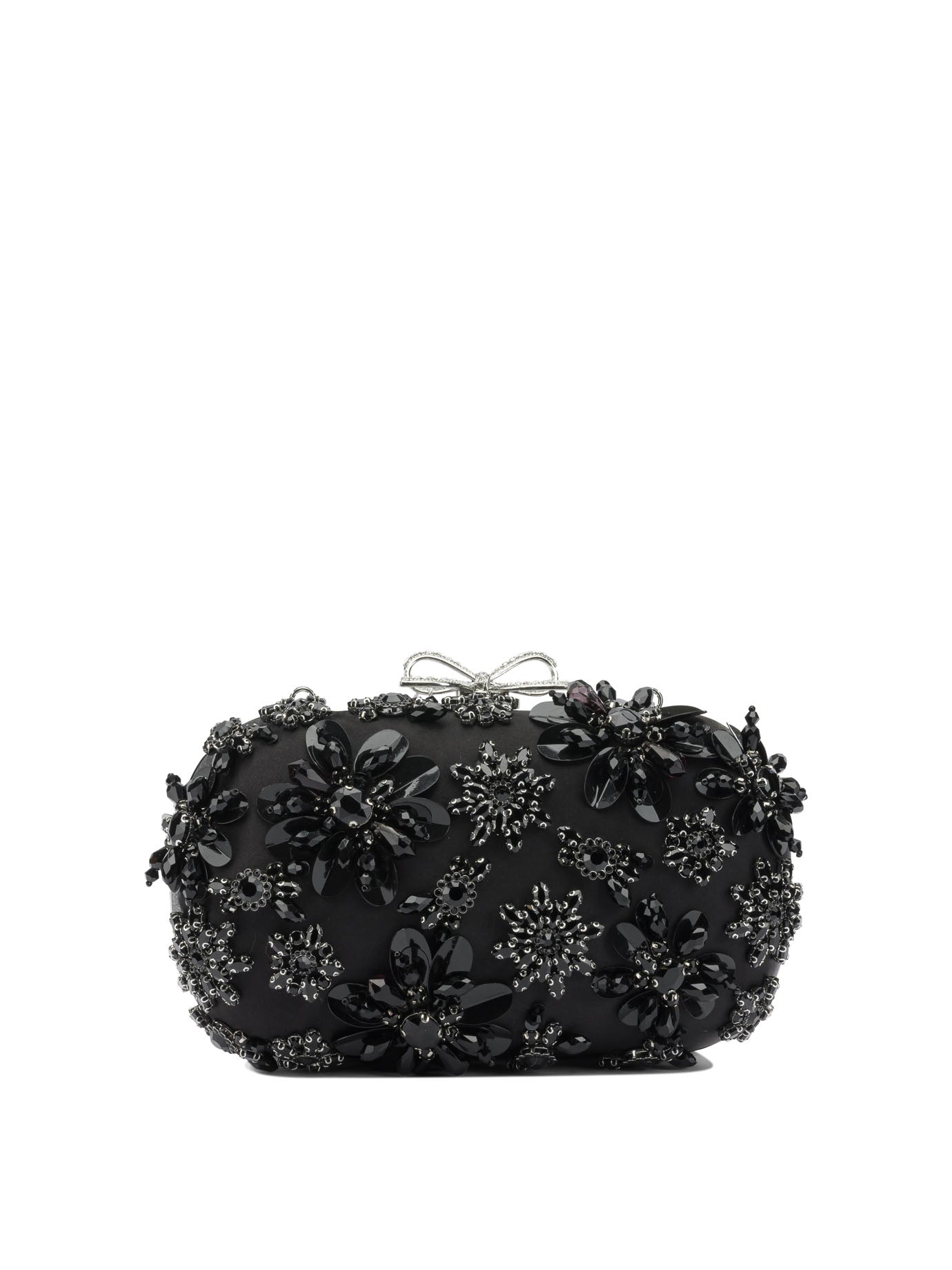 SATIN CLUTCH BAG WITH SELF-PORTRAIT CRYSTALS, MADE FROM A SMOOTH SATIN MAIN FABRIC, FEATURES A RIGID AND COMPACT STRUCTURE. THE TOP LINING IS DECORATED WITH BEADED FLORAL EMBROIDERY AND EMBOSSED APPLIED CRYSTALS. A DISTINCTIVE BOW, THE BRAND'S SIGNATURE ELEMENT, IS APPLIED TO THE FRONT. THE SILHOUETTE OF THE BAG IS ESSENTIAL, WITH SHARP GEOMETRIC LINES AND A CONSTRUCTION WITHOUT VISIBLE SEAMS.
