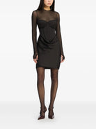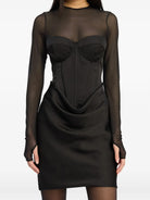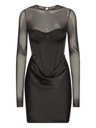 Make a bold statement in this stunning ROTATE BIRGERCHRISTENSEN Satin Corset Mini Dress. This show-stopping piece features a structured corset bodice in luxurious satin that creates a flattering silhouette, paired with sultry long mesh sleeves for an alluring contrast of textures.