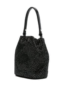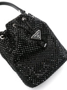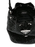 Elevate your evening ensemble with this exquisite Prada Satin Crystal Embellished Bag. Crafted from luxurious black satin and adorned with shimmering glass crystal embellishments, this sophisticated bucket bag features the iconic enamel triangle logo that epitomizes Prada's timeless elegance.