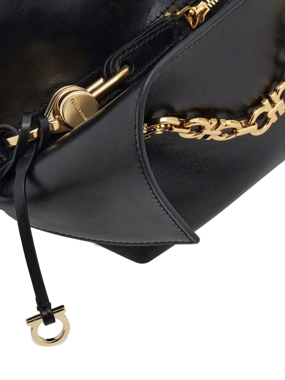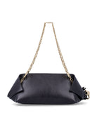Elevate your evening ensemble with this exquisite Ferragamo clutch, a masterpiece of Italian luxury craftsmanship. The supple black leather features an elegant gathered design that creates a sophisticated silhouette, while the gleaming gold-tone chain strap offers versatile styling options—wear it as a clutch or drape it over your shoulder.