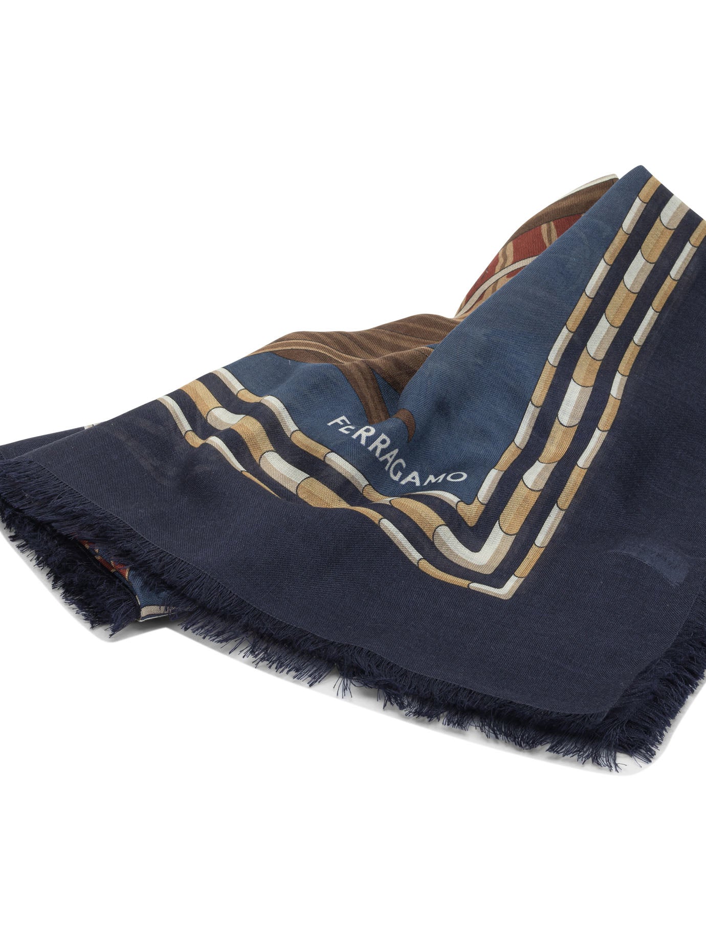 Elevate your accessory collection with this exquisite silk scarf from Ferragamo. Featuring an intricate feather motif in rich navy, warm brown, and golden tones, this luxurious piece showcases the Italian house's commitment to artisanal craftsmanship and timeless elegance.