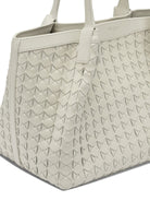 Serapian small "Secret" shoulder bag made of hand-woven lambskin nappa leather with Italian calfskin inserts. The soft structure develops into a compact silhouette with double handles and a rounded line. The body of the bag is worked according to the brand's signature Mosaic technique, which combines strips of nappa leather into a continuous-looking graphic pattern. Magnetic snap closure integrated into the top opening.