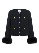 REFINED AND EFFORTLESSLY ELEGANT, THIS BLACK BOUCLÉ JACKET BY SELF-PORTRAIT EMBODIES TIMELESS SOPHISTICATION. THE REMOVABLE FAUX FUR CUFFS ADD A TOUCH OF DRAMA, WHILE GOLD BUTTONS BRING AN OPULENT FINISH. IDEAL FOR ELEVATING EVERYDAY LOOKS OR PAIRING WITH EVENING DRESSES FOR A POLISHED STATEMENT.