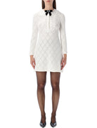 ROMANTIC AND REFINED, THIS WHITE LACE KNIT MINI DRESS BY SELF-PORTRAIT FEATURES A DELICATE BIB COLLAR AND A REMOVABLE BLACK VELVET BOW BROOCH FOR A VINTAGE-INSPIRED TOUCH. ITS SOFT STRETCH KNIT AND GENTLY FLARED FIT CREATE AN EFFORTLESSLY FEMININE SILHOUETTE — IDEAL FOR DINNERS, CULTURAL EVENTS, OR ELEGANT SOIRÉES.