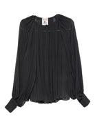 Elevate your wardrobe with this sophisticated semi-sheer buttoned blouse from Semicouture. Crafted in timeless black, this elegant top features a graceful gathered neckline with delicate pleating and long sleeves finished with buttoned cuffs for a polished touch.
