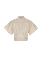 The cropped silhouette and classic shirt collar create a modern, fashion-forward look that's perfect for both day and night. With its button-front closure and comfortable short sleeves, this versatile top effortlessly transitions from casual daytime wear to evening occasions.