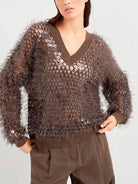 SEQUIN EMBELLISHED V-NECK BRUSHED SWEATER