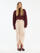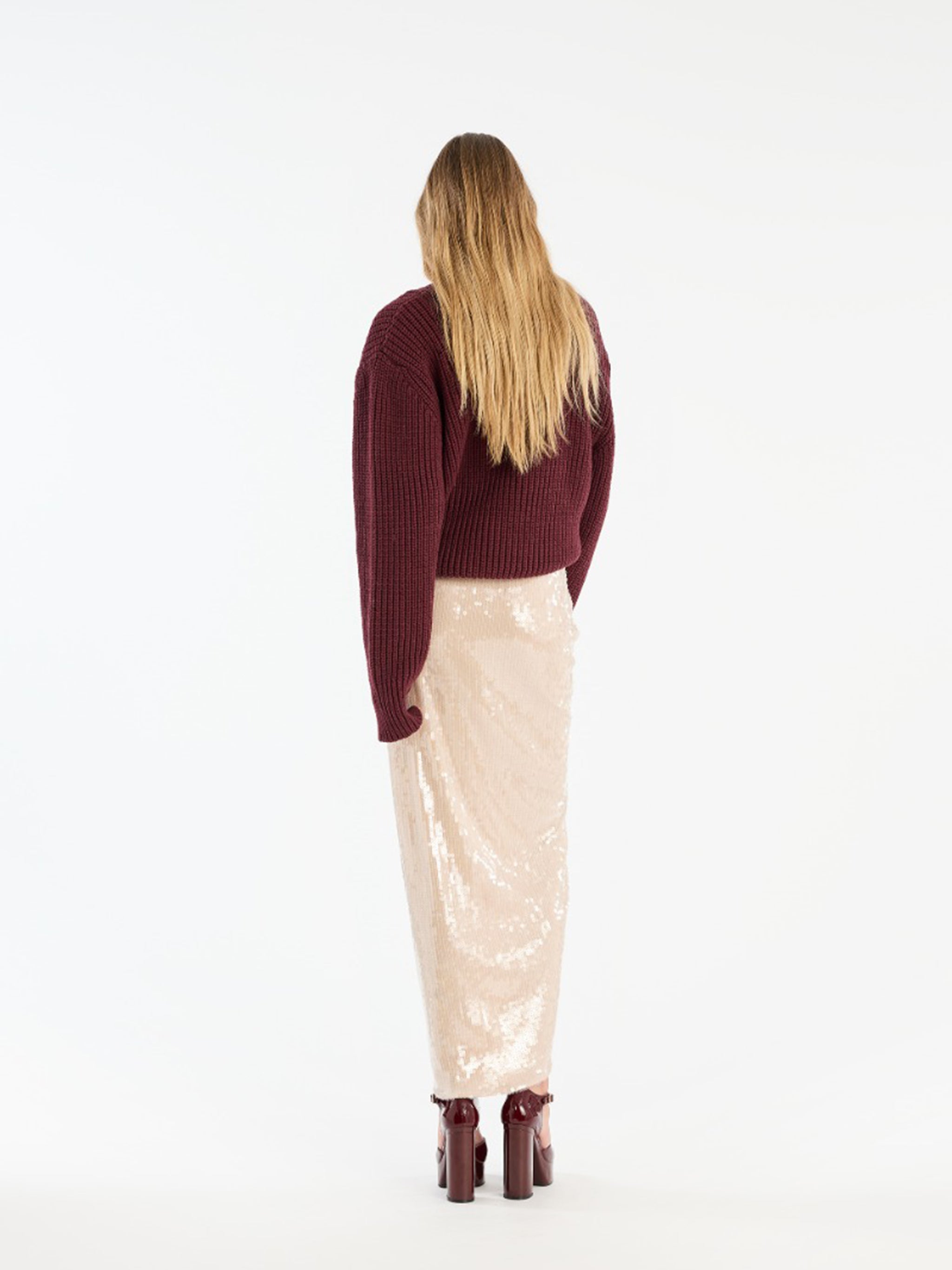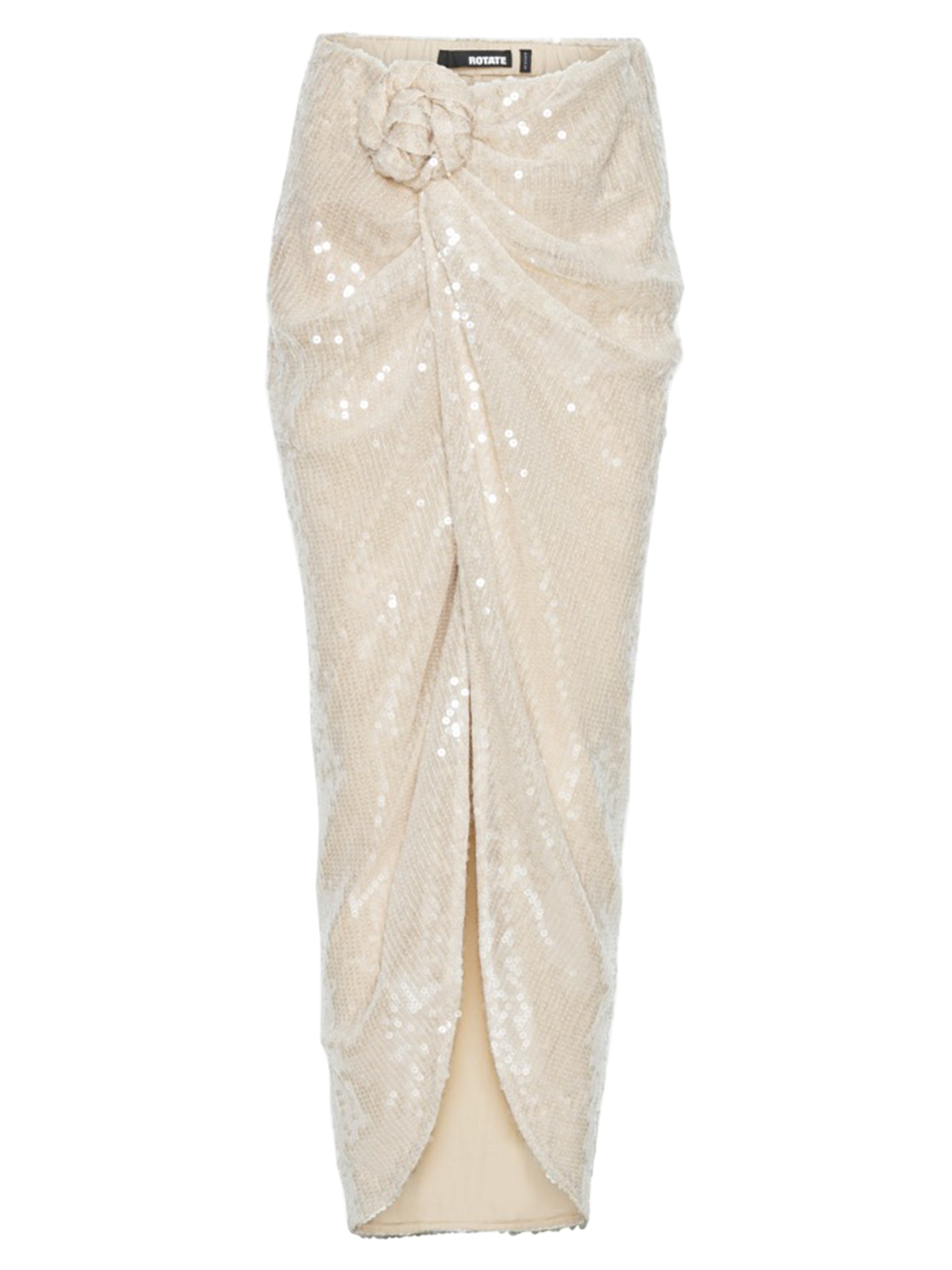 SEQUINED SKIRT WITH KNOT DRAPED FLOWER DETAIL AT THE WAIST LINED MODEL WEARS SIZE 34 95% RECYCLED POLYESTER, 5% ELASTANE MADE IN CHINA
