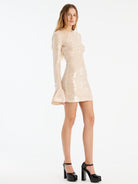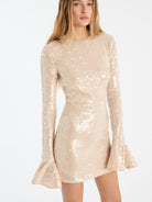 FITTED MINI DRESS WITH SEQUINS LONG SLEEVES WITH FLARED CUFFS BACK ZIP CLOSURE MODEL WEARS SIZE 34 95% RECYCLED POLYESTER, 5% ELASTANE MADE IN CHINA