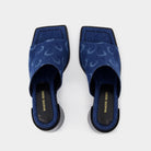 MARINE SERRE HEELED MULES IN MOON ALLOVER PRINT DENIM.