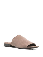 BRUNELLO CUCINELLI SHORE BEIGE SUEDE LEATHER FLAT SANDALS. PURE SHORE BEIGE SUEDE LEATHER SANDALS, SQUARED OPENED TOE, TOP TONAL STRAP, SLIP-ON STYLE, WIDE HEEL WITH SILVER-TONE PEARL DETAILS, LEATHER SOLE.
