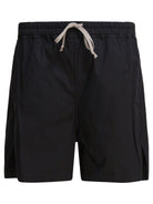 Rick Owens "Boxer" shorts made of cupro twill, a plant-derived material that is lightweight and fluid. The design features a knee-length structure with an elasticized waist and slightly lowered crotch. The fabric surface feels shiny with a soft feel. Completing the garment are side welt pockets and beveled side slits, which define a regular, linear silhouette.
