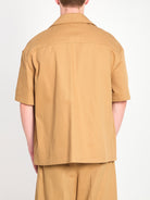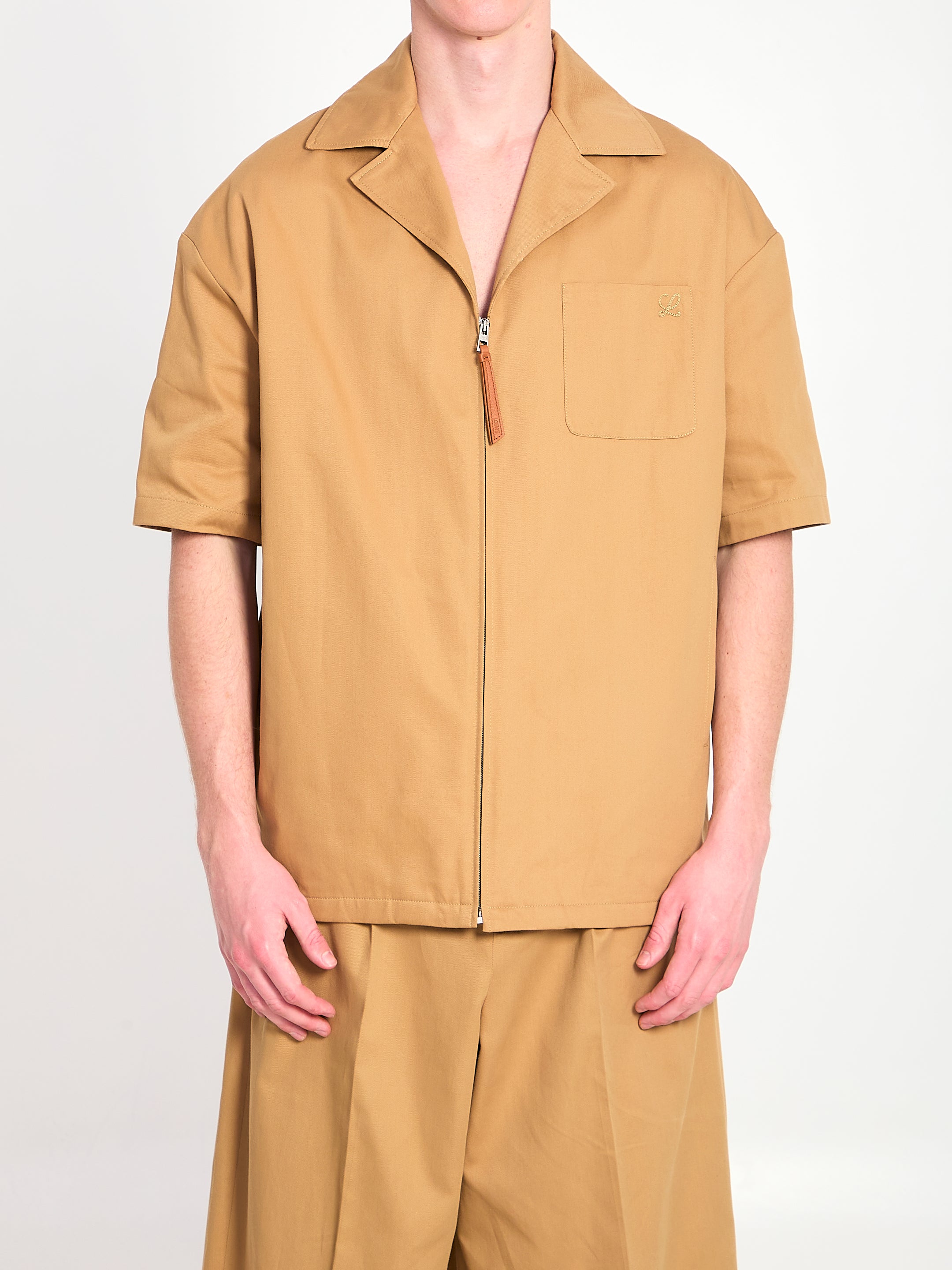 ALMOND BEIGE LIGHTWEIGHT COMPACT COTTON GABARDINE SHIRT. FEATURES A CAMP COLLAR, FRONT CLOSURE WITH ZIP AND PUZZLE PULL TAB, TWO WELT POCKETS ON THE FRONT, ONE PATCH POCKET ON THE CHEST WITH L EMBROIDERY. SLIGHTLY LOOSE FIT.