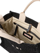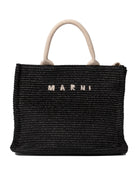 Elevate your everyday style with this sophisticated shoulder bag from Marni. Crafted from woven raffia in a rich black hue with contrasting natural handles, this tote features the iconic Marni logo prominently displayed across the front.