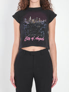 SHRUNK CITY OF ANGELS T-SHIRT IN BLACK FADED STRETCH JERSEY. FEATURING A WASHED EFFECT, CREW NECK, ULTRA-SHORT SLEEVES, CROPPED HEM, AND A CITY OF ANGELS PRINT ON THE FRONT.