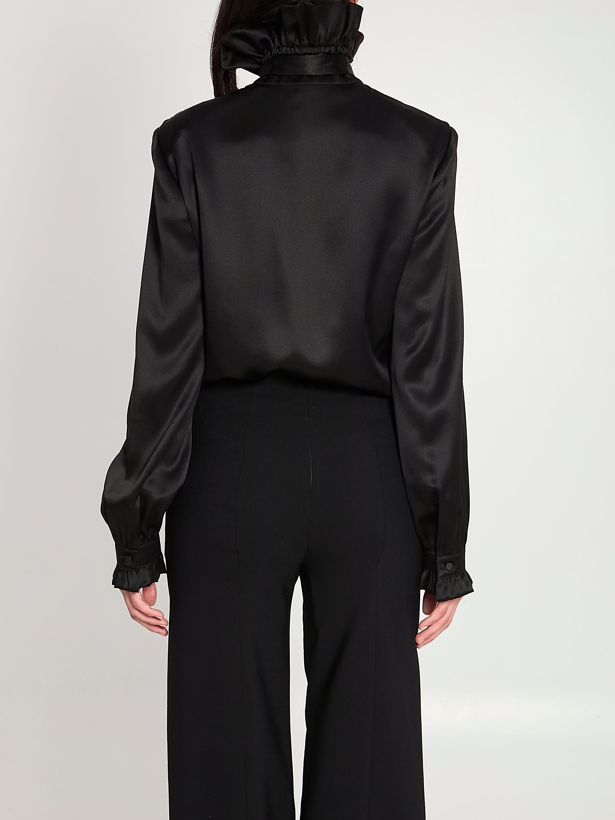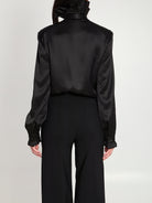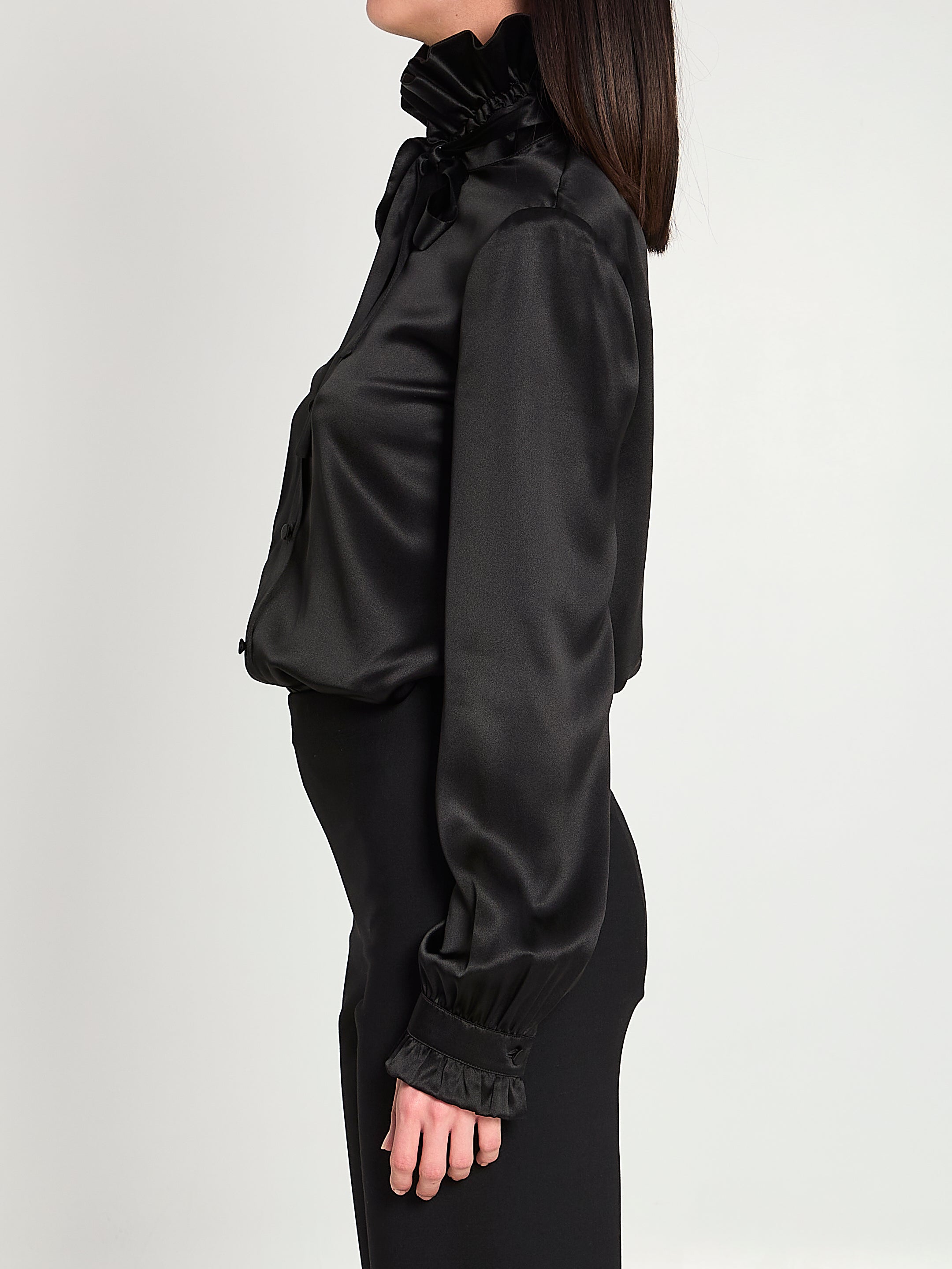 BLACK SILK SATIN SHIRT. FEATURES A RUFFLED COLLAR, TIEABLE BOW, FRONT BUTTON CLOSURE WITH COVERED BUTTONS, LONG SLEEVES, BUTTON CUFFS WITH RUFFLES. REGULAR FIT.