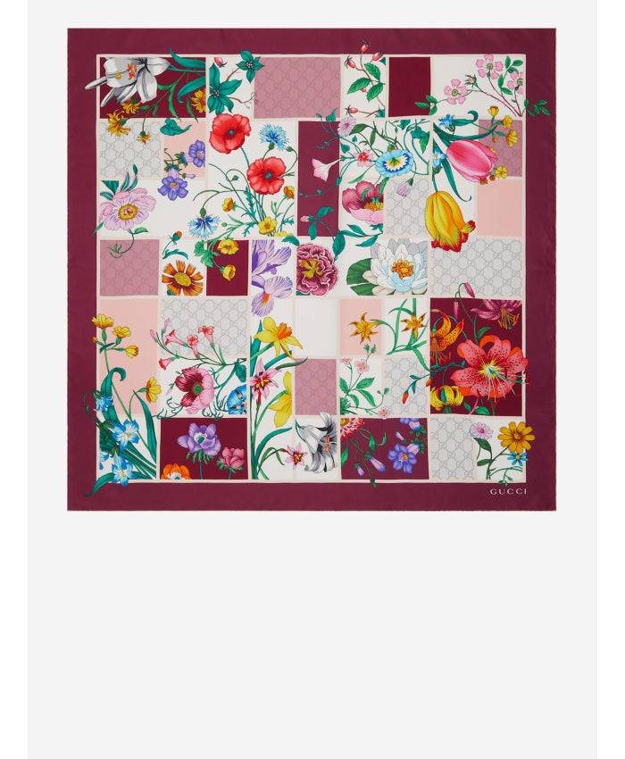 Elevate your accessory collection with this exquisite Gucci silk scarf featuring a stunning patchwork design of vibrant floral motifs.