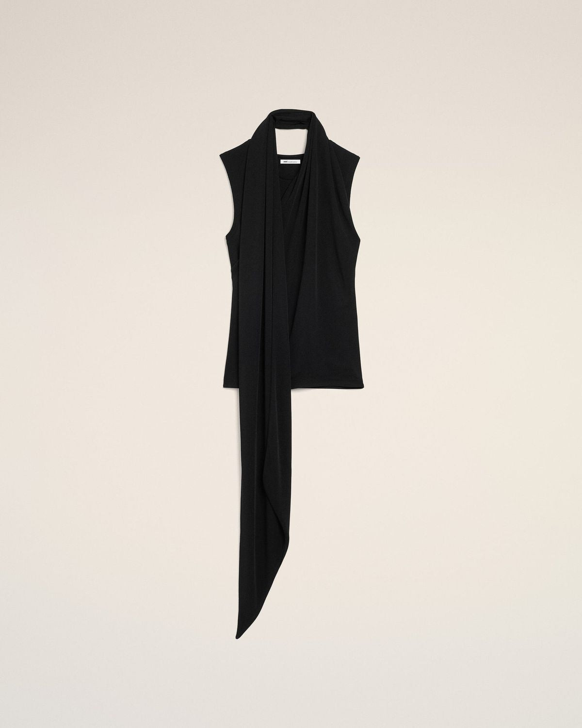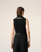 Elevate your wardrobe with this sophisticated Sleeveless Lavalliere Top from AMI Paris. Featuring a dramatic draped lavalliere detail that cascades elegantly down the front, this sleek black top effortlessly combines Parisian chic with modern minimalism.