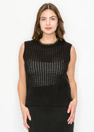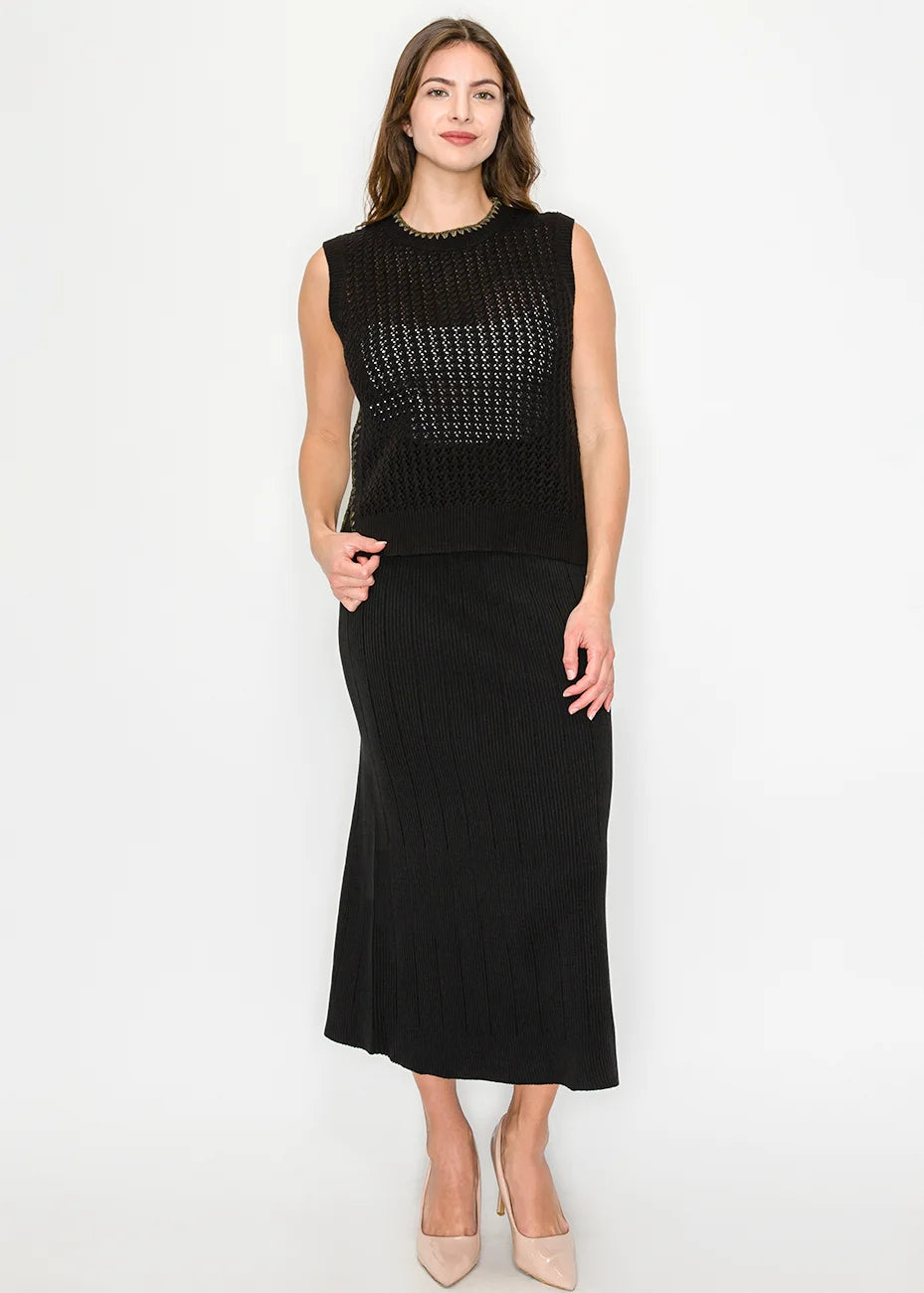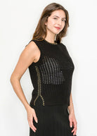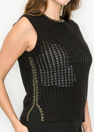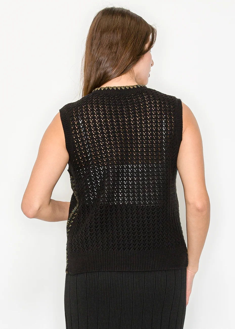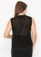 Soft open-knit vest featuring metallic thread accents and ribbed hem. Ideal for layering through changing seasons.