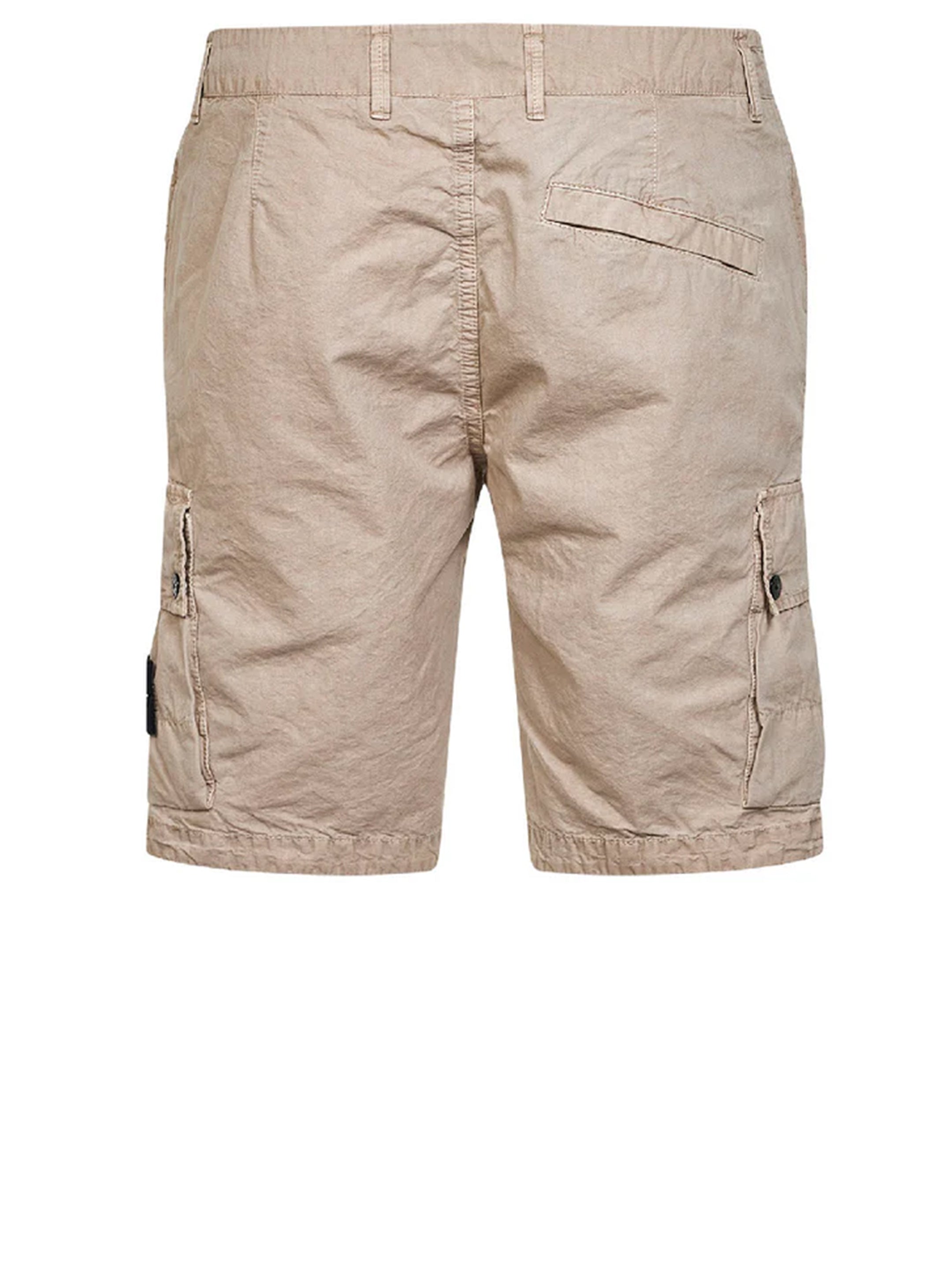 Sand beige lightweight cotton shorts. They feature belt loops, a button and zip front closure, two side zip pockets, two side cargo flap pockets with buttons, a rear welt button pocket, an iconic badge on the side. Slim fit.