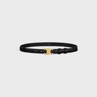 Elevate your everyday style with this sleek 18mm belt from Celine. Crafted from supple black leather, this slim belt features an elegant gold-toned circular buckle that adds a touch of understated luxury to any outfit.