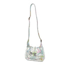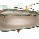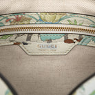 The 1961 Jackie features a printed leather body, an adjustable flat strap, a detachable strap extender, an open top with piston-lock closure, and an interior zip pocket.