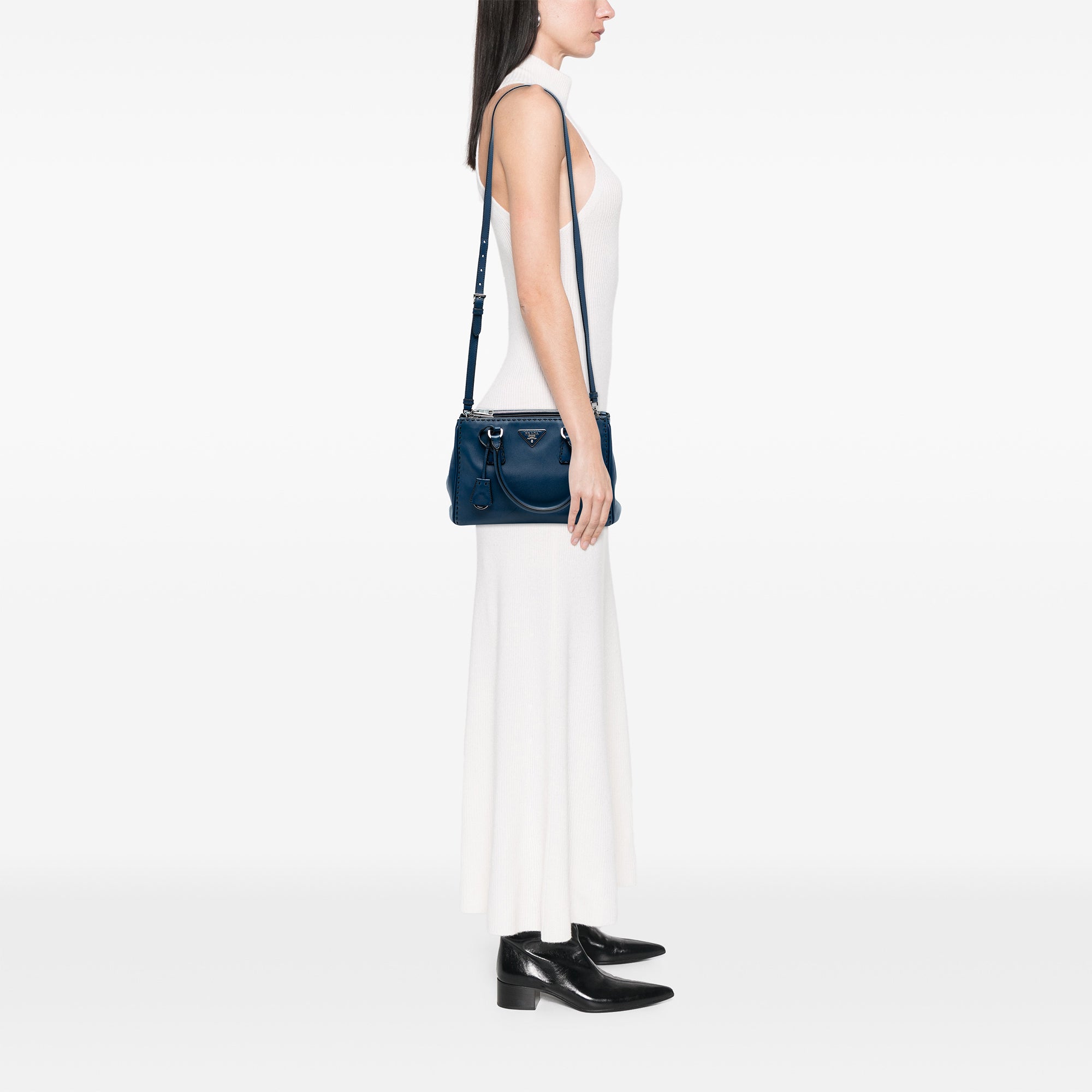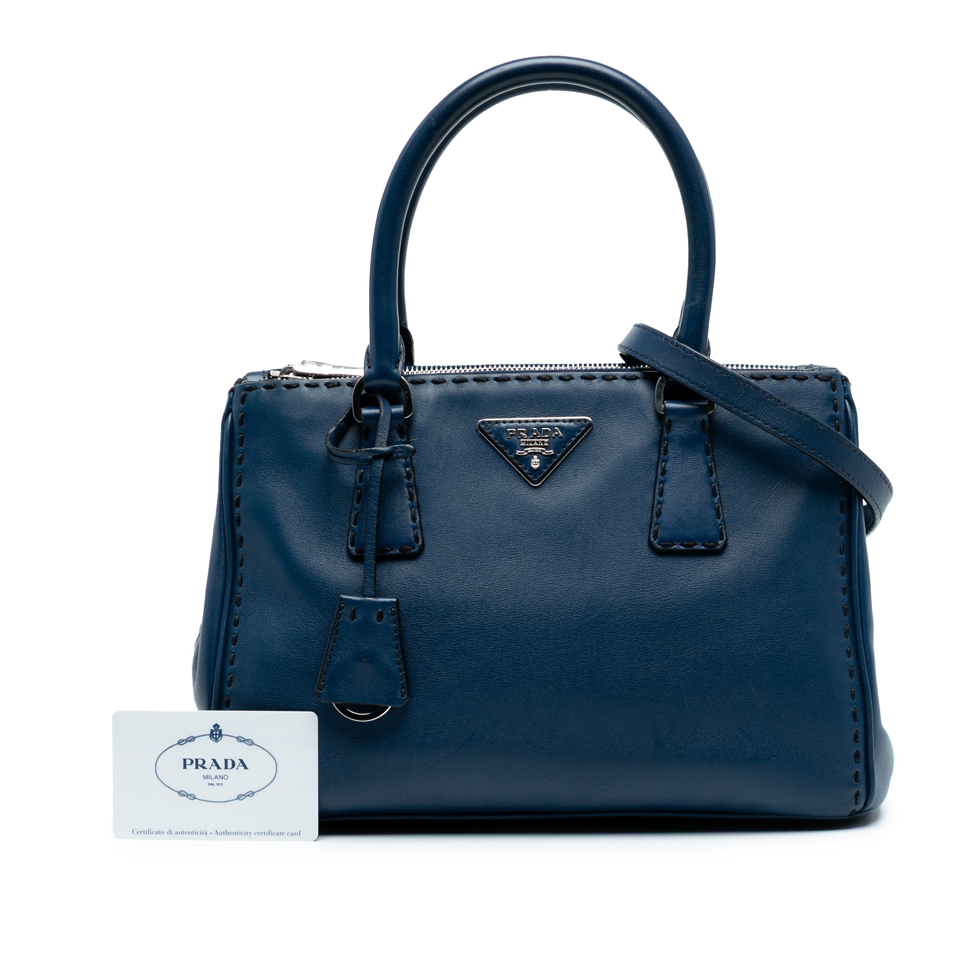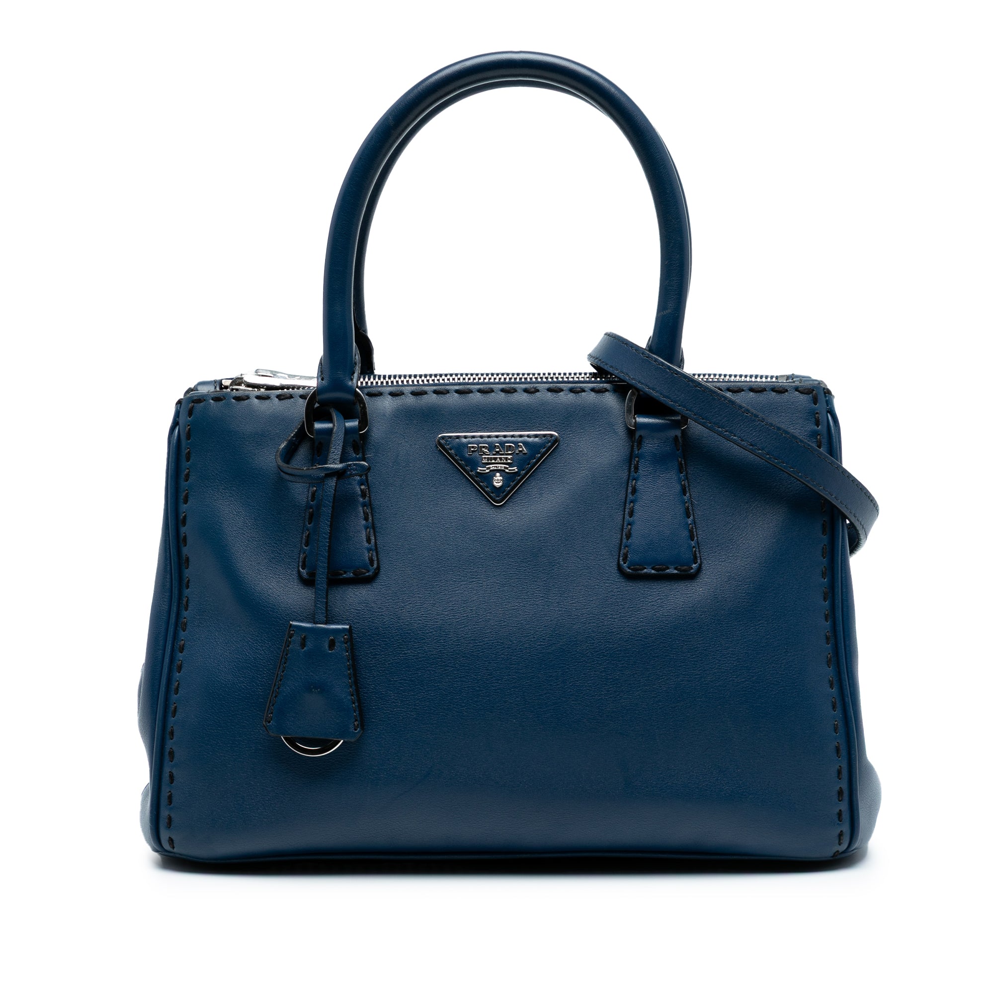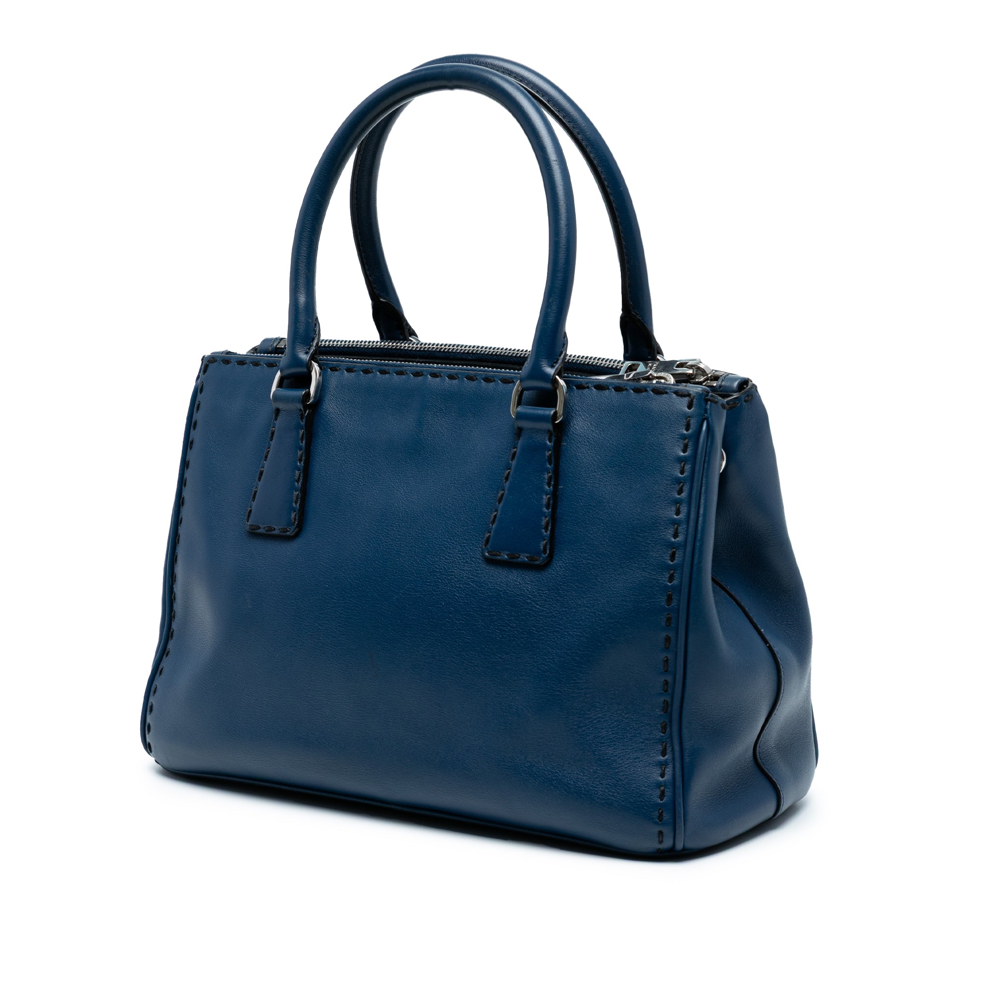 The Prada Galleria Double Zip Satchel is a timeless investment piece that embodies sophisticated Italian craftsmanship. This small city calf leather satchel features exquisite hand-stitched details, elegant rolled leather handles, and a versatile detachable flat strap for crossbody or shoulder wear.