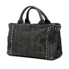Elevate your everyday style with this stunning Prada Small Denim Canapa Bijoux and Grommet Satchel. Crafted from studded denim, this sophisticated bag features eye-catching bijoux embellishments and grommet details that add an edgy, luxurious touch to any ensemble.