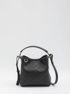 SMALL GG EMBLEM BUCKET BAG IN BLACK LEATHER WITH EMBOSSED GG MOTIF. FEATURES LIGHT GOLD-TONE HARDWARE, A TOP HANDLE WITH HOOK CLOSURE, TWO COMPARTMENTS AND A CENTRAL COMPARTMENT WITH SNAP BUTTON FASTENING, A REMOVABLE AND ADJUSTABLE LEATHER SHOULDER STRAP, AND AN AUTOMATIC MAGNETIC CLOSURE. DUST BAG INCLUDED. ANY IRREGULARITIES IN THE LEATHER ARE CHARACTERISTIC OF THE MATERIAL AND SHOULD NOT BE CONSIDERED DEFECTS.