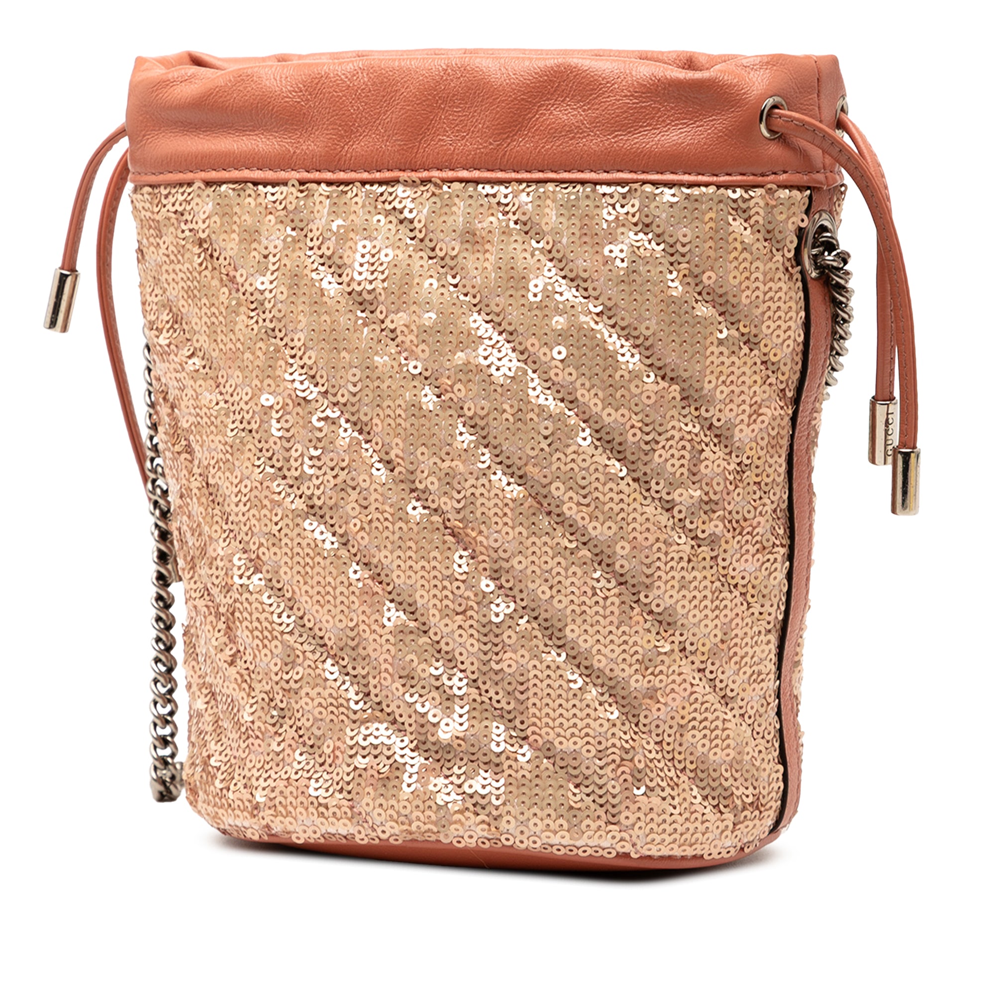 This bucket bag features a quilted leather body with sequins detail, a chain link strap, an open top with a drawstring closure, and interior slip pockets.