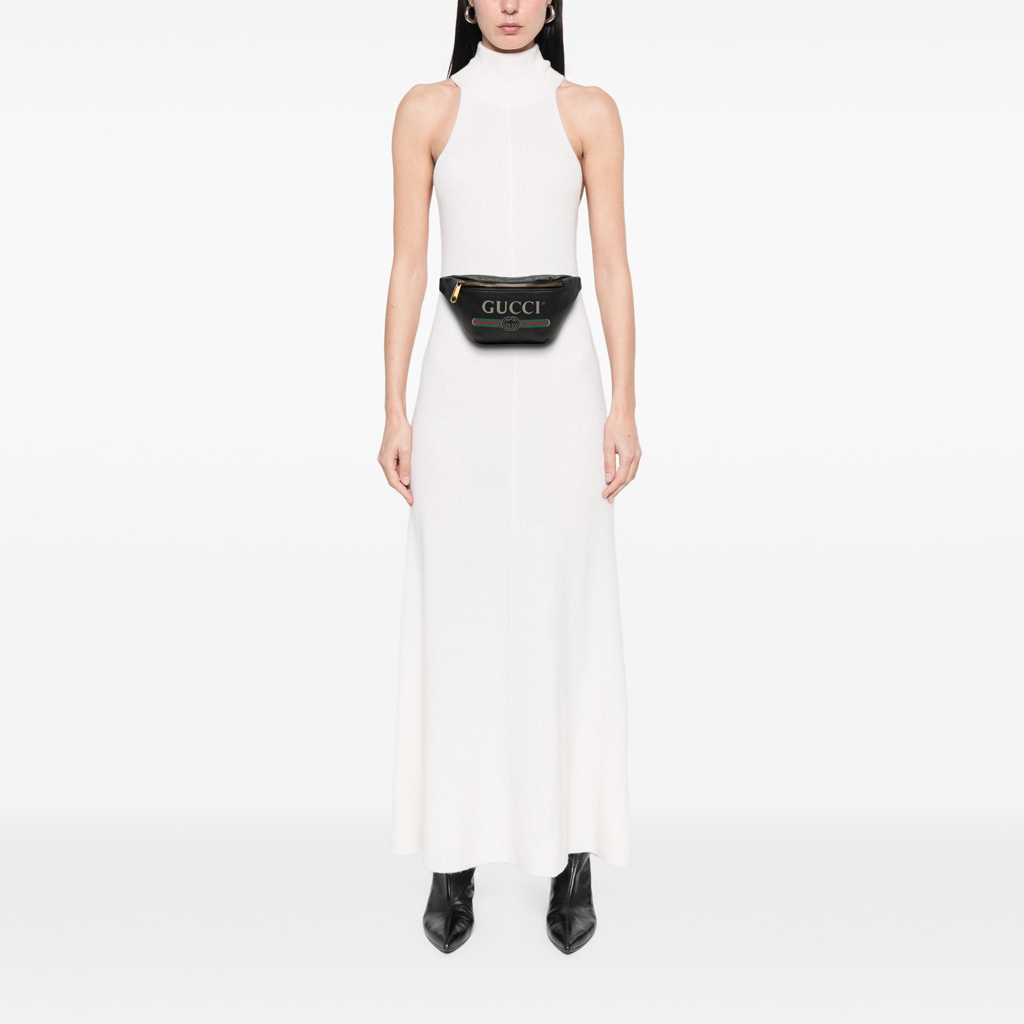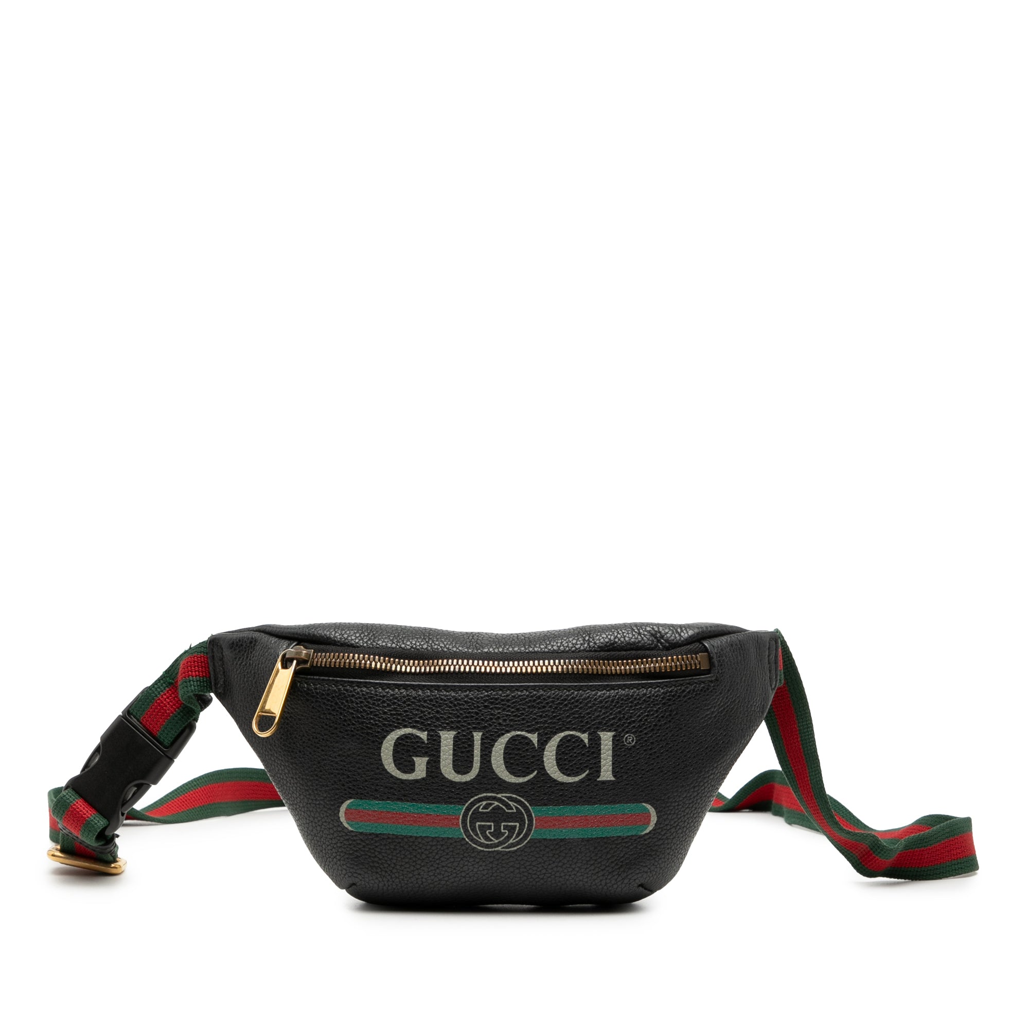 The Logo Belt Bag features a printed leather body, an adjustable nylon strap with buckle closure, and top zip closure.
