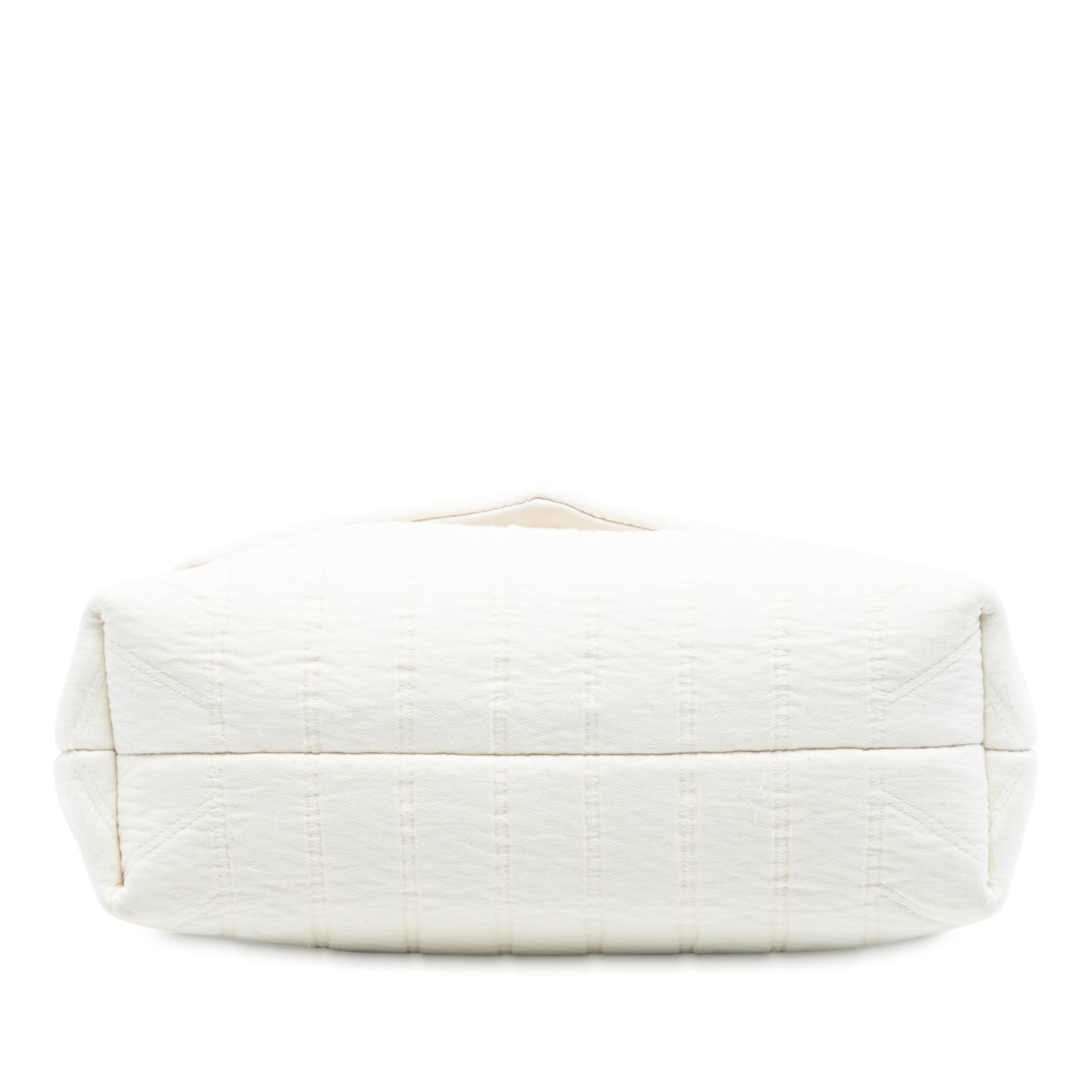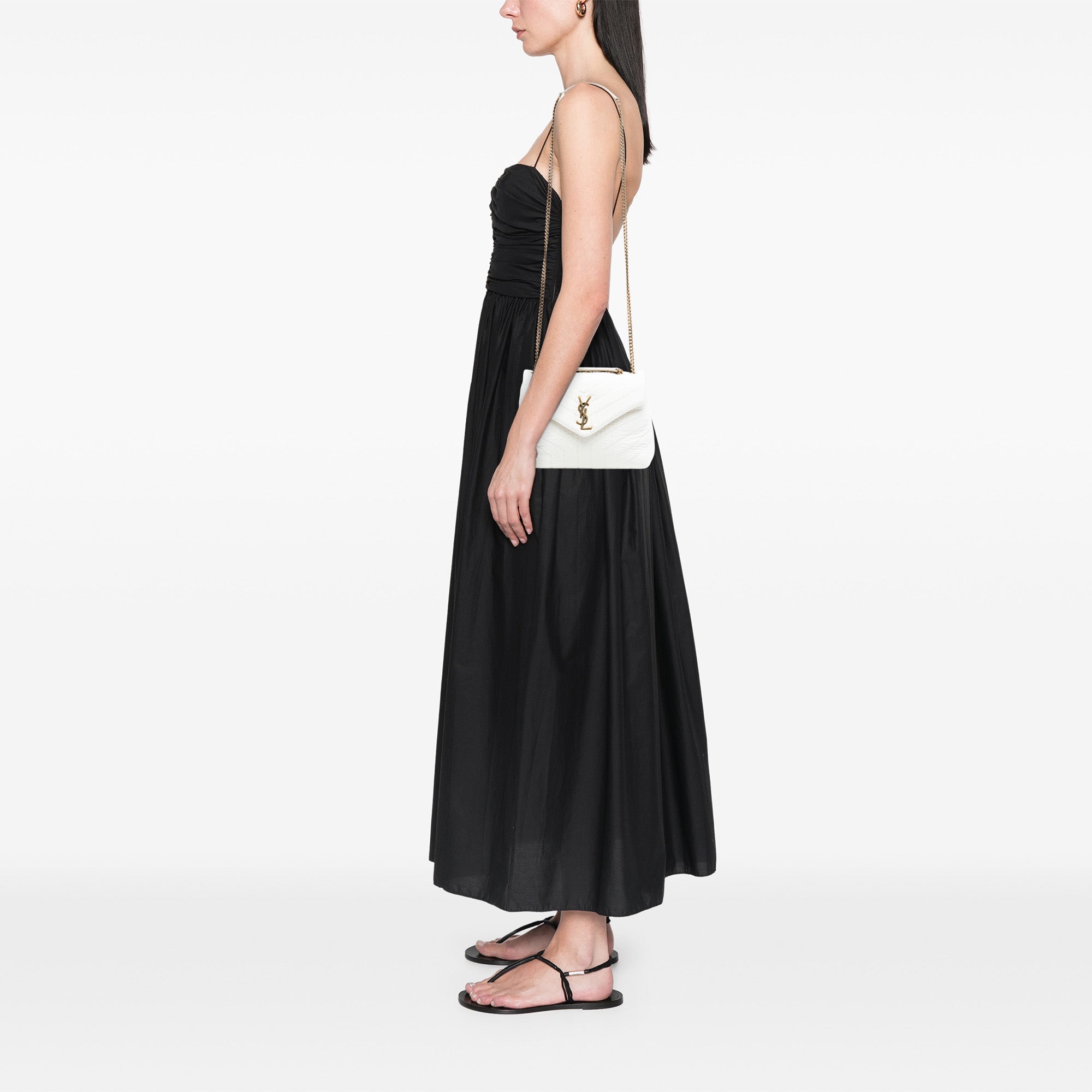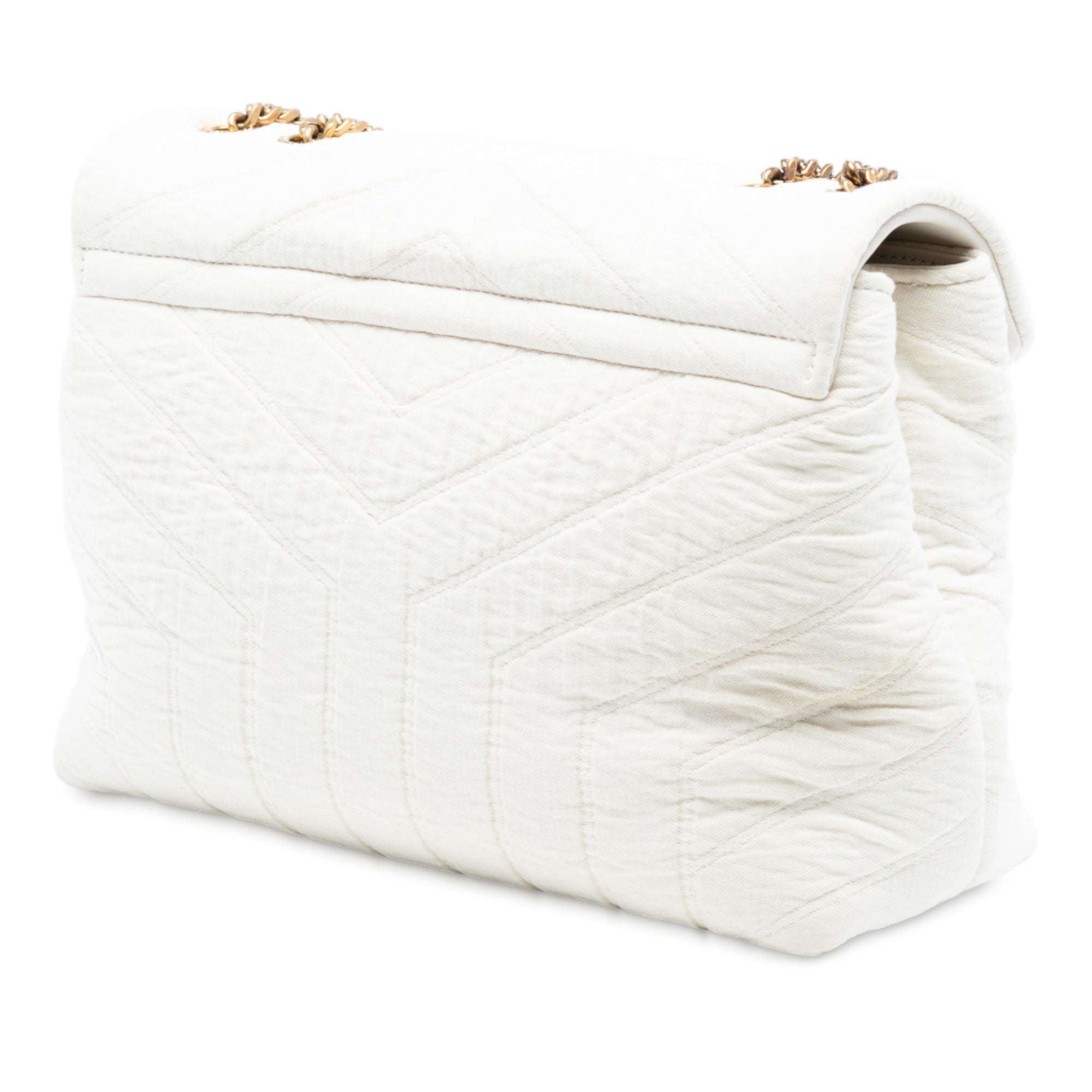 The Saint Laurent Small Jersey Loulou Puffer Shoulder Bag is a luxurious statement piece that effortlessly combines elegance with contemporary design. Featuring a beautifully quilted cotton body in pristine white, this iconic bag showcases the signature YSL hardware and a sophisticated chain link strap with leather guard for comfortable wear.