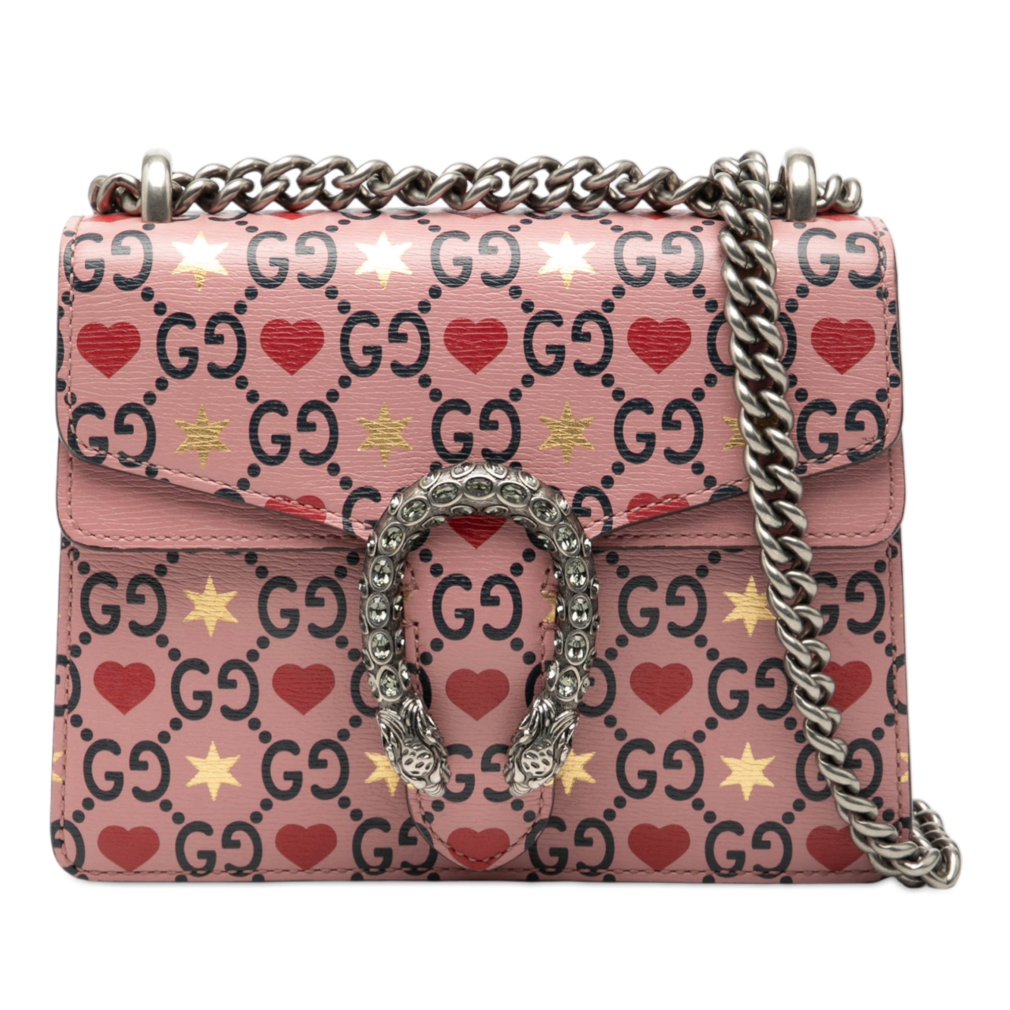 The Gucci Dionysus Small Crossbody is a luxurious statement piece featuring a charming Valentine's Day-inspired printed leather design with the iconic GG monogram pattern adorned with hearts and stars in soft pink tones.