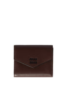 Elevate your everyday essentials with this exquisite small leather wallet from Miu Miu. Crafted from luxurious calf leather in a rich brown hue, this compact wallet features the iconic Miu Miu logo embossed on the front flap for a touch of understated elegance.