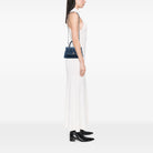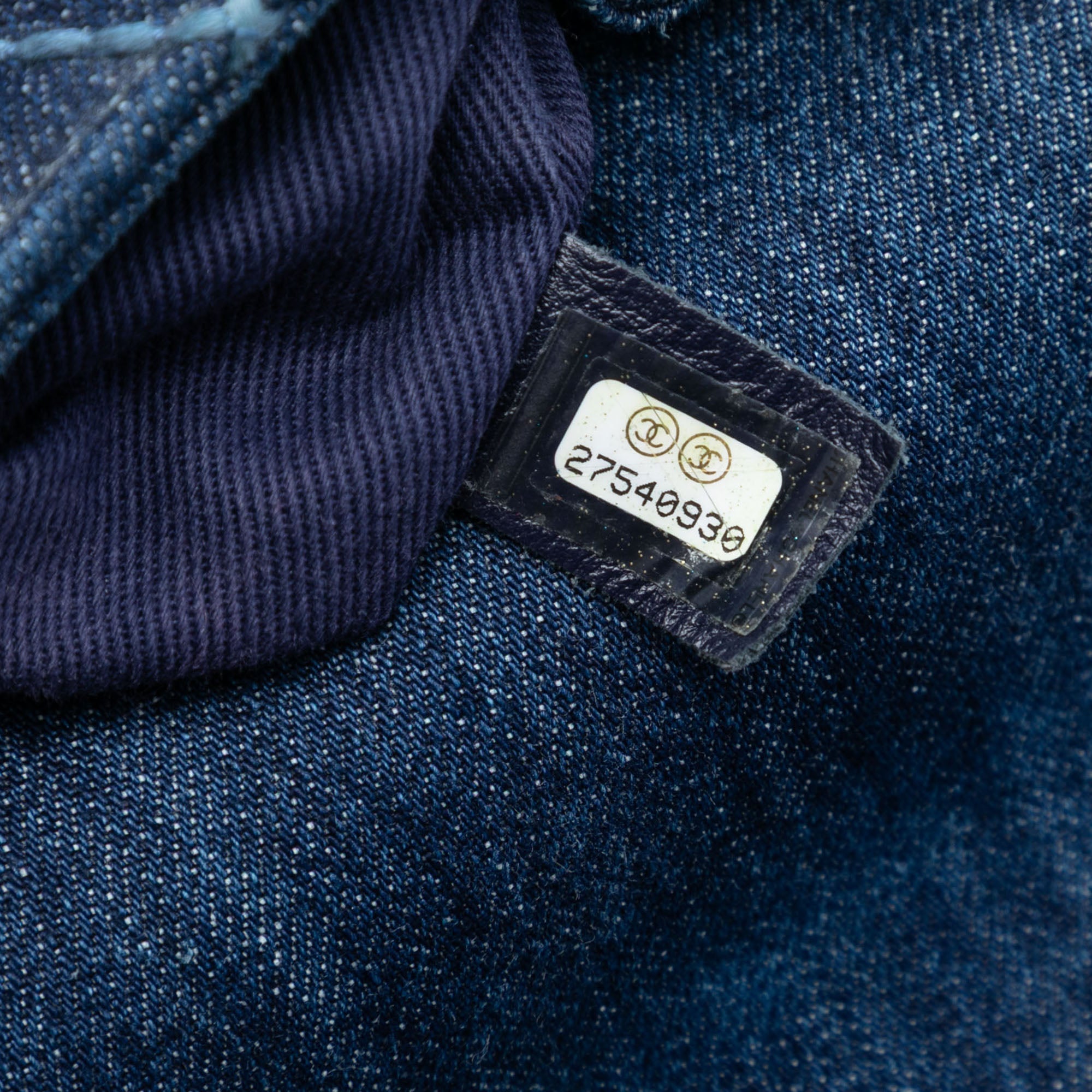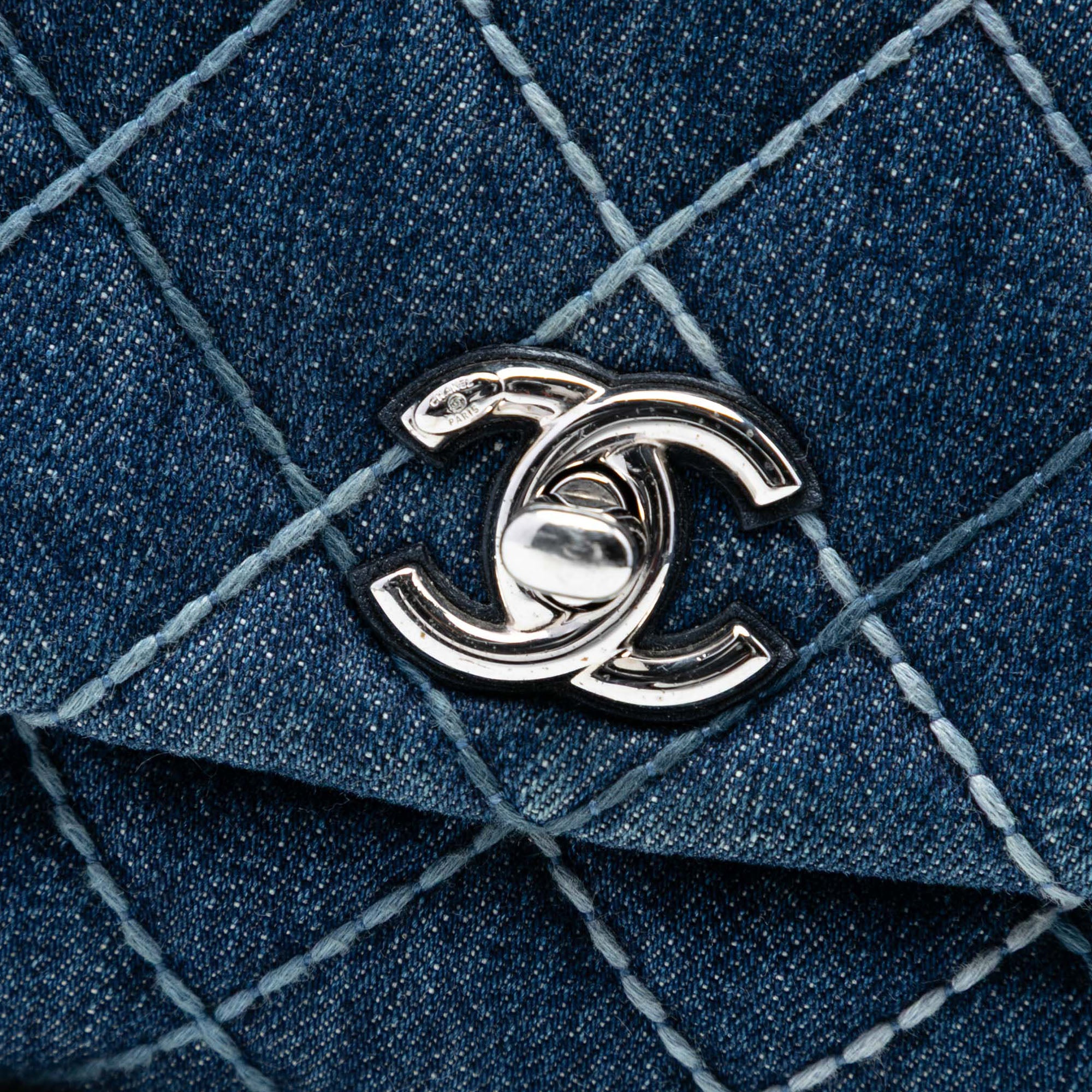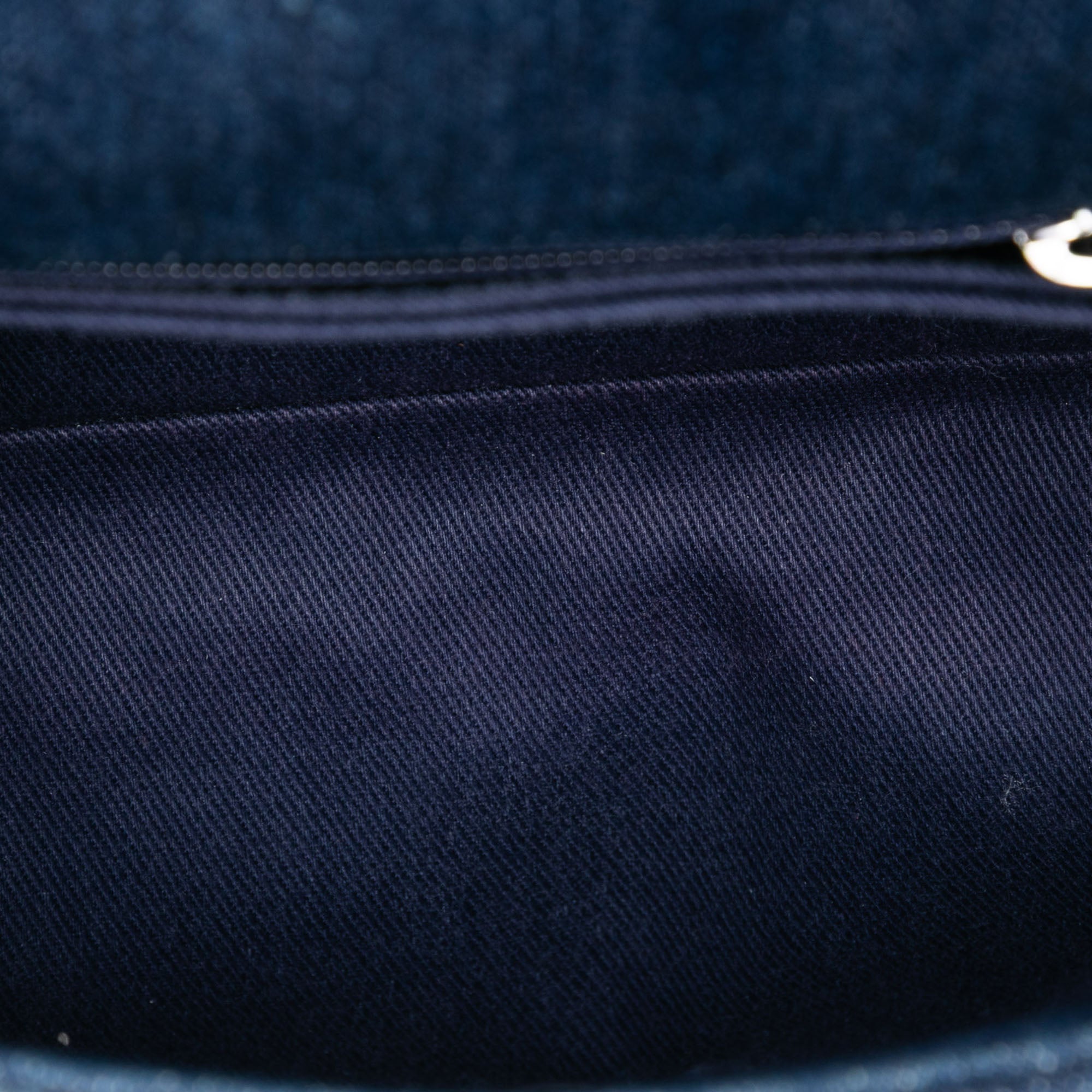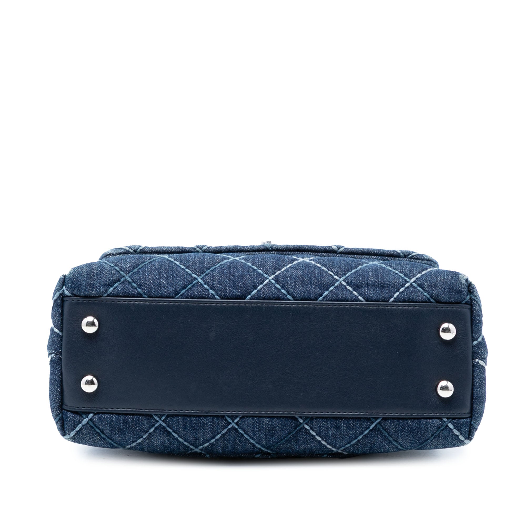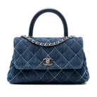 The Coco Handle bag features a quilted denim body, a rolled leather top handle, a leather woven chain straps with leather guard, a front flap with twist lock closure, an exterior back slip pocket, and interior zip and slip pockets.