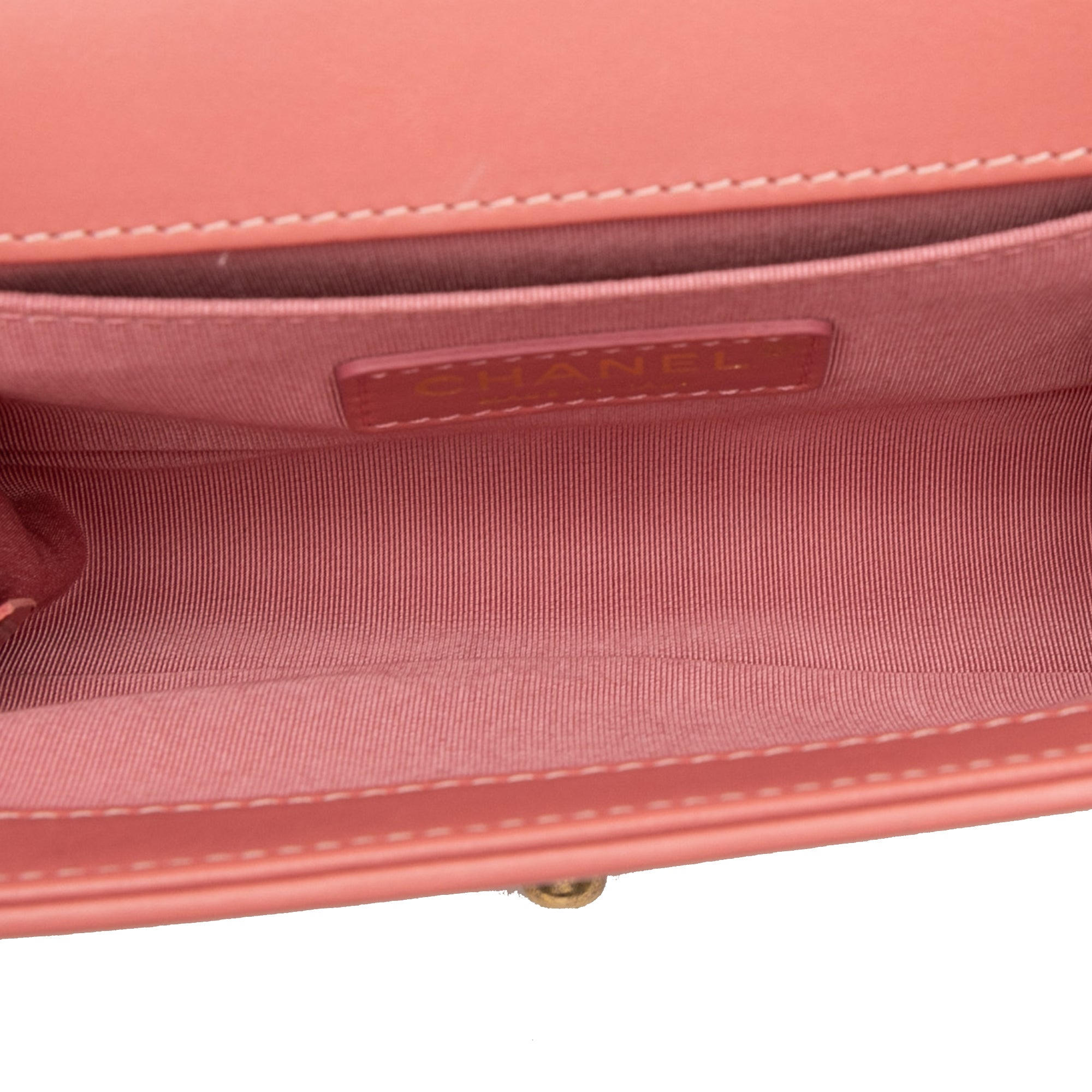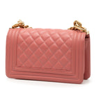 The Boy flap features a quilted lambskin leather body, a curb chain strap, a front flap with a turn lock closure, and an interior slip pocket.