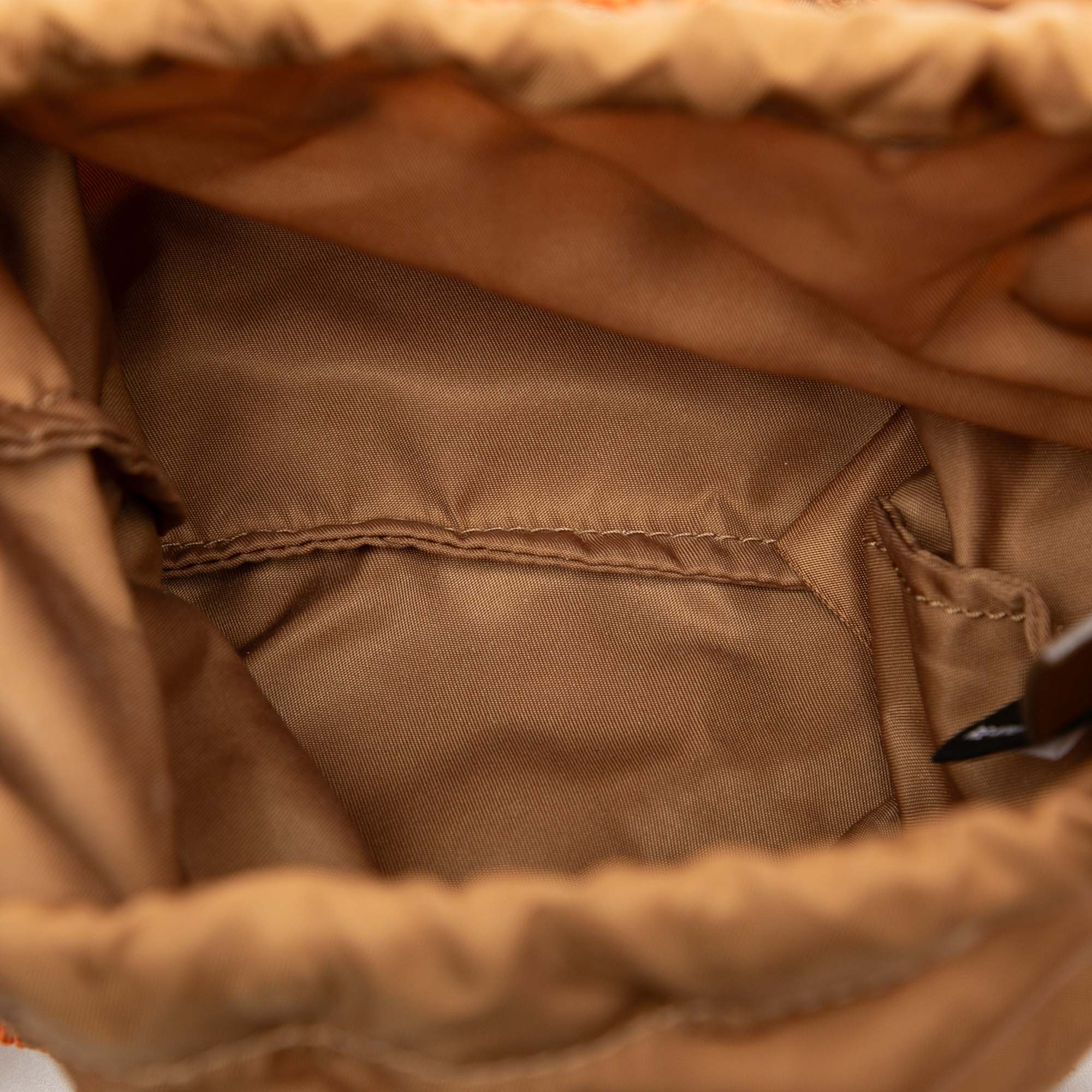 This shoulder bag features a knotted suede and cord body, a braided top handle, and an interior pouch with drawstring closure.
