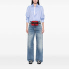 The Ophidia belt bag features a suede body with leather trim, an adjustable flat leather waist strap, a top zip closure, an exterior front zip pocket, and an interior slip pocket.