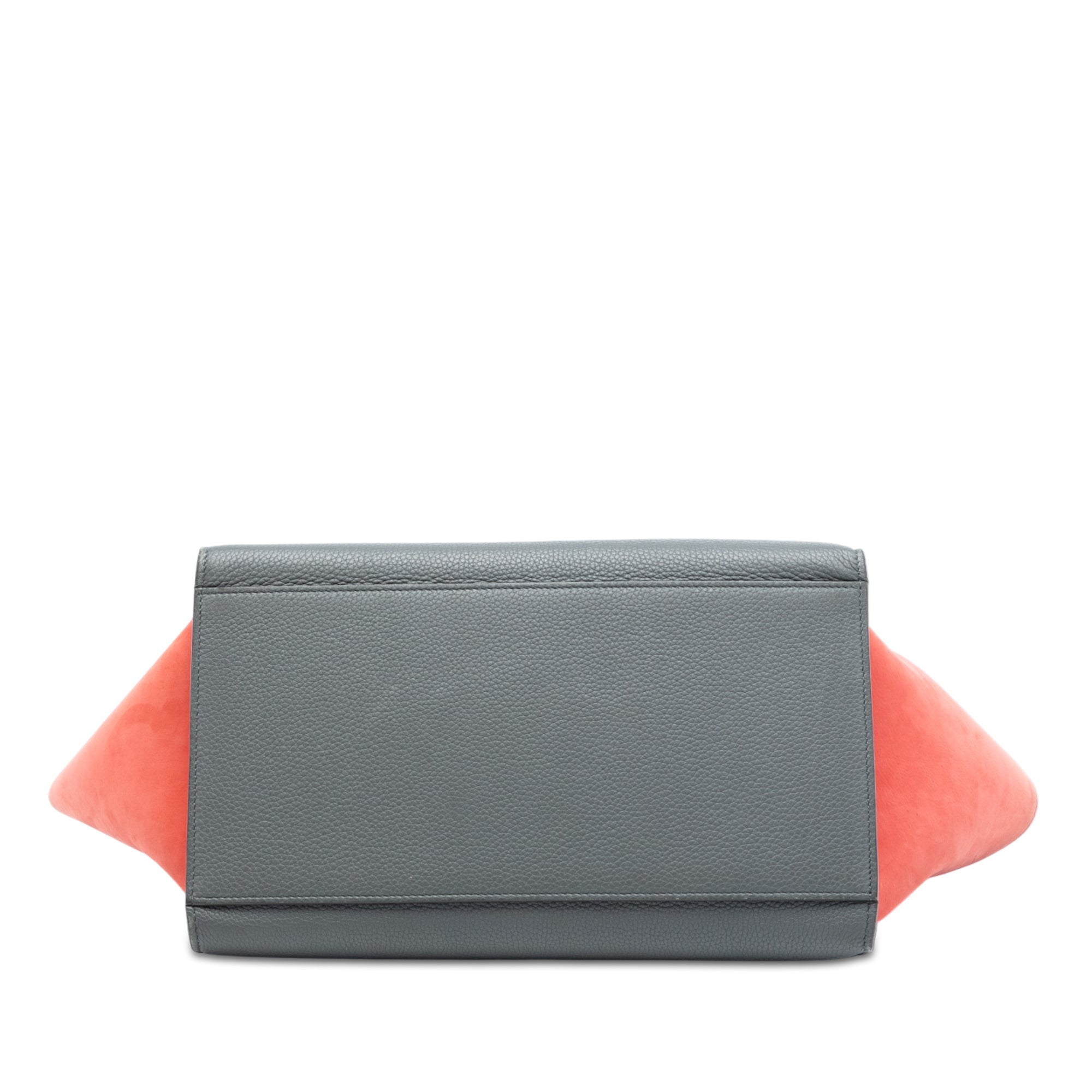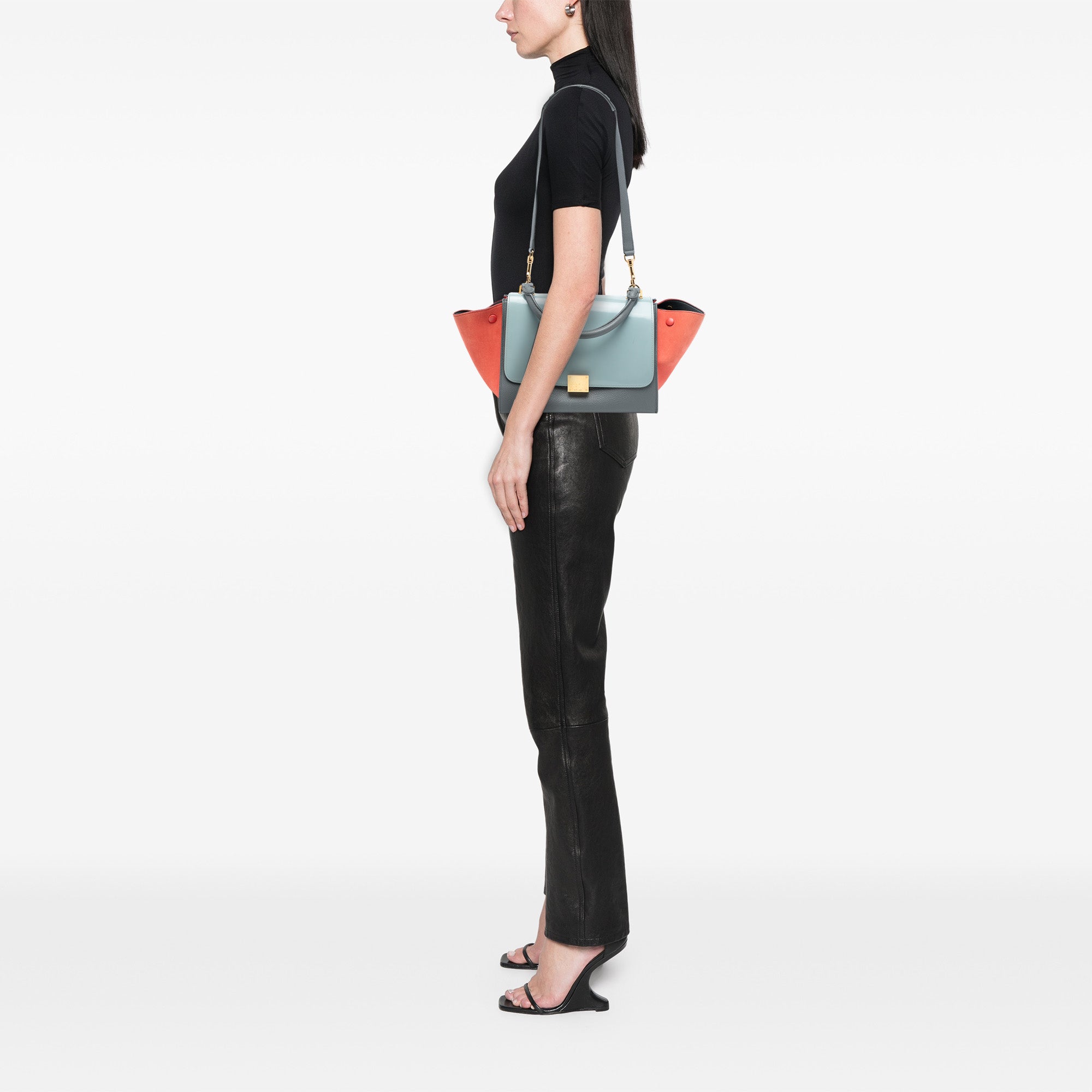 The Trapeze features a leather body, suede leather side panels, a rolled leather top handle, a detachable flat leather strap, a front flap with clasp closure, a top zip closure, and interior slip pockets.