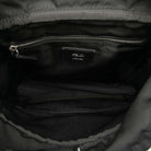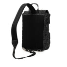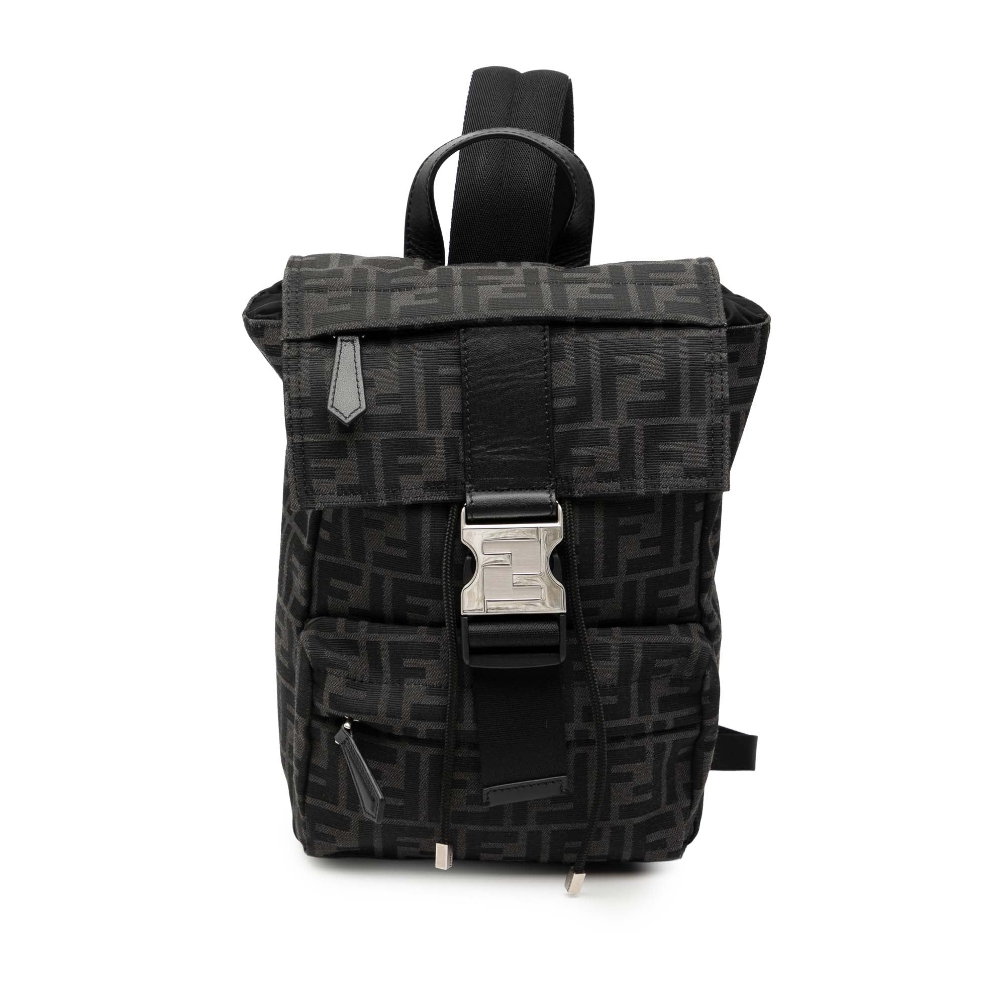 The Fendiness backpack features a canvas body, a flat leather top handle, an adjustable back strap, a front flap with buckle closure, a drawstring closure, exterior front zip pockets, and an interior zip pocket.