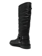 BLACK CALF LEATHER SMOOTH GRAIN PULL-ON STYLE 30MM LOW BLOCK HEEL DEBOSSED LOGO TO THE REAR SILVER-TONE STUD DETAILING MID-CALF LENGTH BRANDED INSOLE FLAT RUBBER SOLE