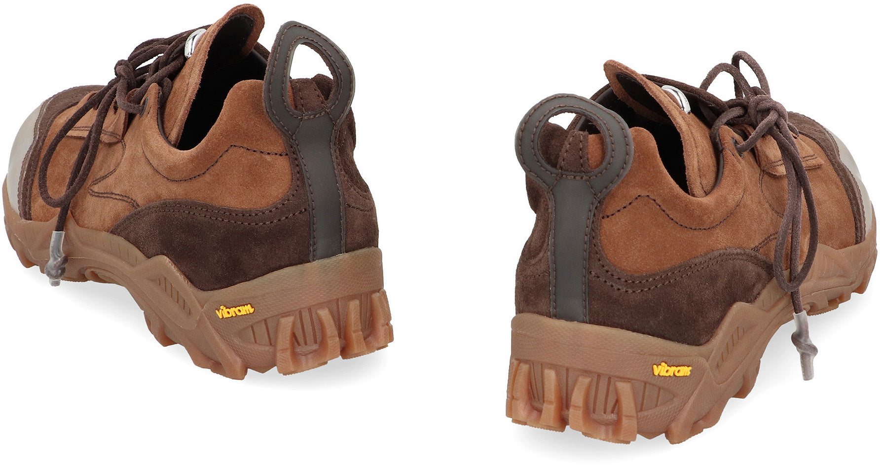 SHOE MADE OF CUT SUEDE IN BITTER COCOA COLOR. CRAFTED FROM BOVINE LEATHER, IT FEATURES A LEATHER AND SUEDE UPPER WITH CONTRASTING PANELS, A POLYURETHANE TOE CAP, AND VIBRAM SOLE. THE SHOE HAS A GENEROUS FIT AND FEATURES AN ASYMMETRIC LACING WITH ROUNDED LEATHER LACES AND RUBBER-COATED TIPS, A METAL RIVET WITH LOGO ON THE TONGUE, AND AN OVAL PULL TAB ON THE HEEL.