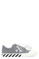 Elevate your sneaker game with these striking Off-White Low-Top Vulc Undercut Sneakers. Featuring the brand's iconic white arrows detail on the side and a distinctive rubber sole with bold black and white diagonal stripes, these sneakers make an unmistakable statement.