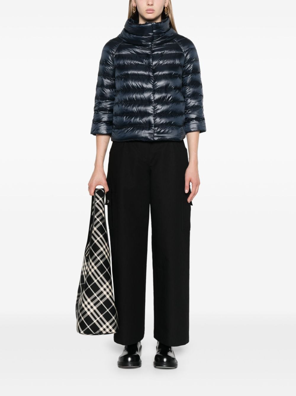NAVY BLUE COTTON-BLEND PADDED DESIGN HIGH NECK PRESS-STUD FASTENING THREE-QUARTER LENGTH SLEEVES STRAIGHT HEM